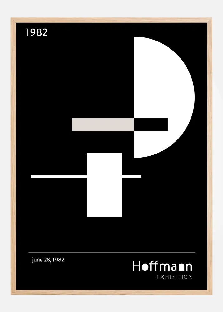 Cette affiche est un parfait exemple de design minimaliste, où chaque élément est soigneusement considéré pour obtenir un fort impact visuel. Le cadre en chêne simple complète l'aspect moderne et fait de cette œuvre d'art une décoration idéale pour un intérieur contemporain ou un bureau qui apprécie les lignes épurées et les forts contrastes. Cet affiche n'est pas seulement un hommage à l'héritage artistique de Hoffmann, mais aussi une déclaration de design intemporel.