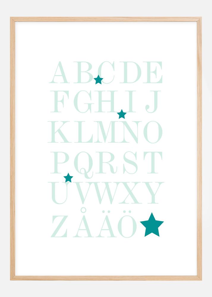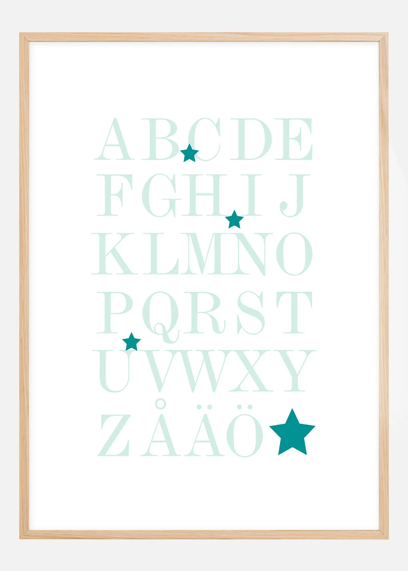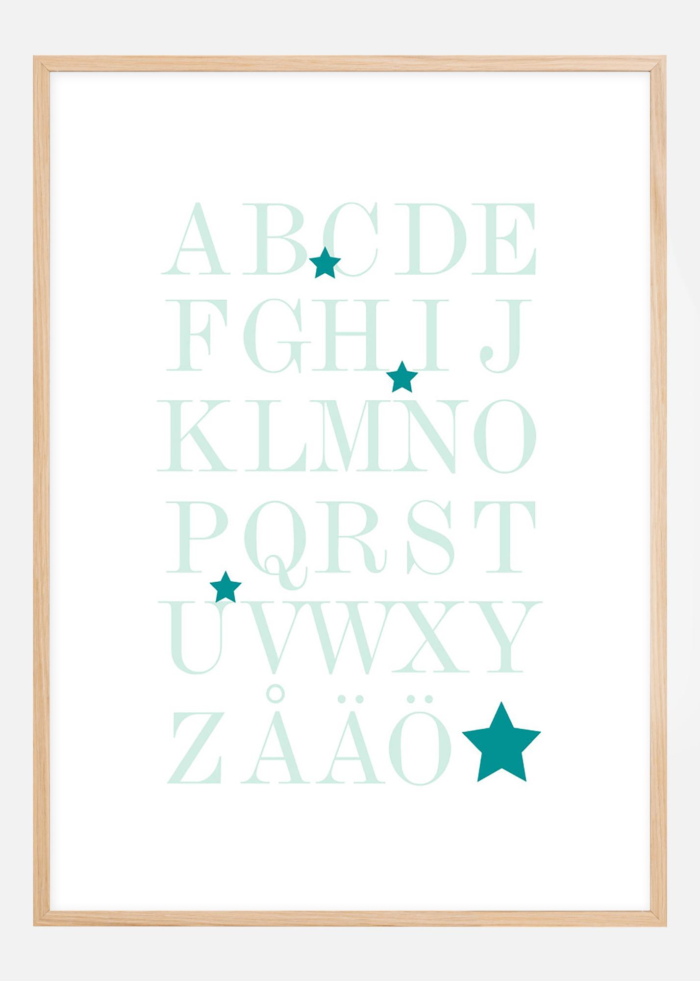 Impression graphique de l'ensemble de l'alphabet, de A à Ö, dans les nuances vert turquoise de la mer. Le motif pédagogique convient bien à la chambre des enfants pour pratiquer l'alphabet, mais aussi sur d'autres murs de la maison. L'expression épurée fait que le print s'adapte à tous les styles de décoration et types de maisons. Associez-le volontiers avec d'autres tableaux pour créer un mur de tableaux sur un thème ou décorez le mur avec le print des chiffres de 1 à 10.