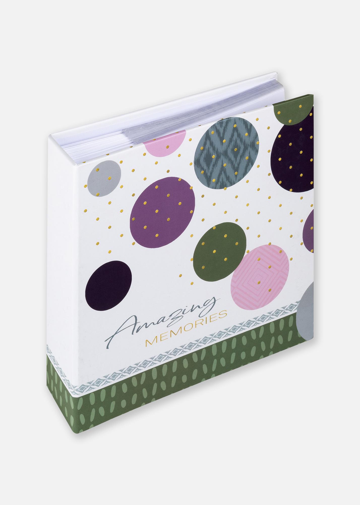 Les souvenirs joyeux méritent un emballage joyeux ! Cet album photo a un design très décoratif et merveilleux qui convient à vos plus chers souvenirs photo. Le devant de la couverture est pourvu d'un motif coloré composé entre autres de cercles de différentes couleurs et tailles, de petits points dorés adorables - et du titre ”Amazing memories”.