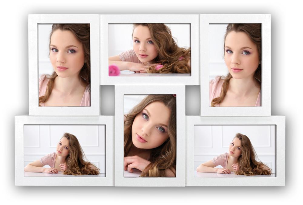 Cadre pêle-mêle moderne et blanc avec de la place pour 6 images au format paysage et portrait. Parfait lorsque vous souhaitez créer un collage photo personnel à accrocher au mur.