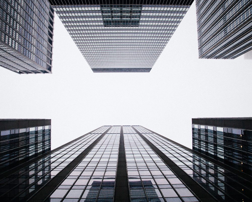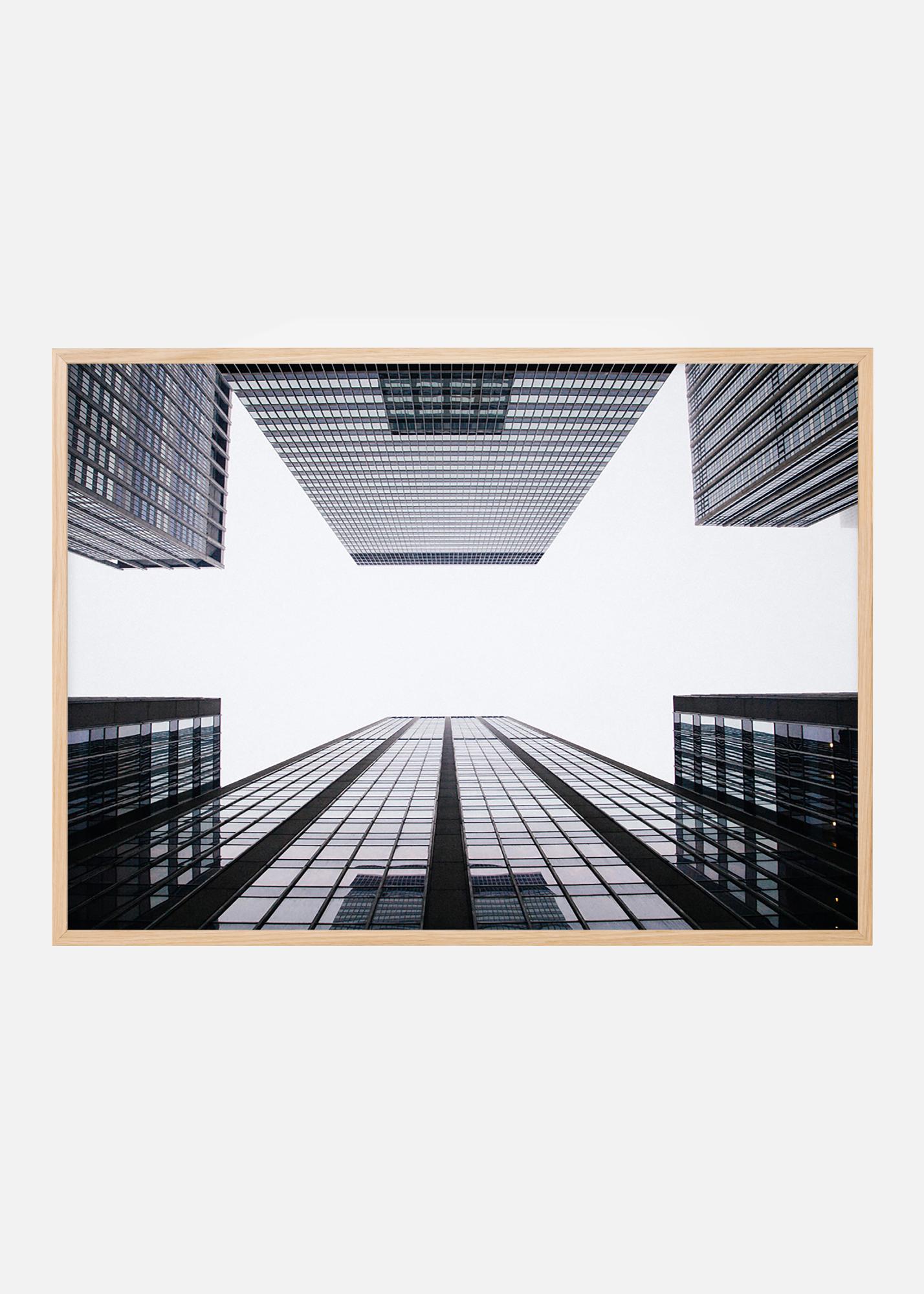 Posters d'architecture avec des gratte-ciels en croissance contre un ciel nuageux blanc. Image épurée de bâtiments sombres sur un fond blanc, avec les reflets du ciel dans les vitres. Le cadeau parfait pour ceux qui aiment les portraits graphiques de bâtiments. L'impression est mise en valeur dans un cadre noir qui renforce les tons sombres de l'image et se marie bien avec d'autres photographies d'architecture.