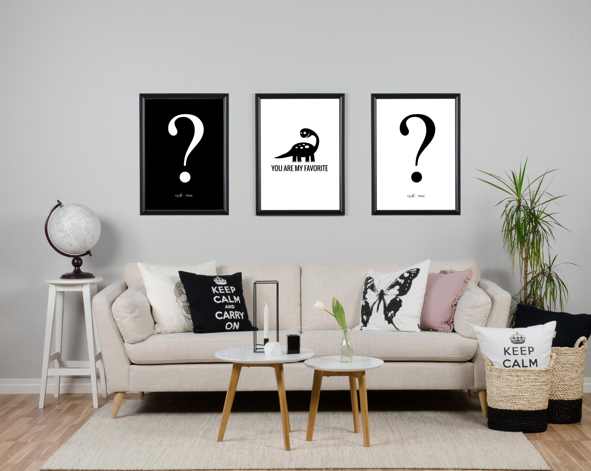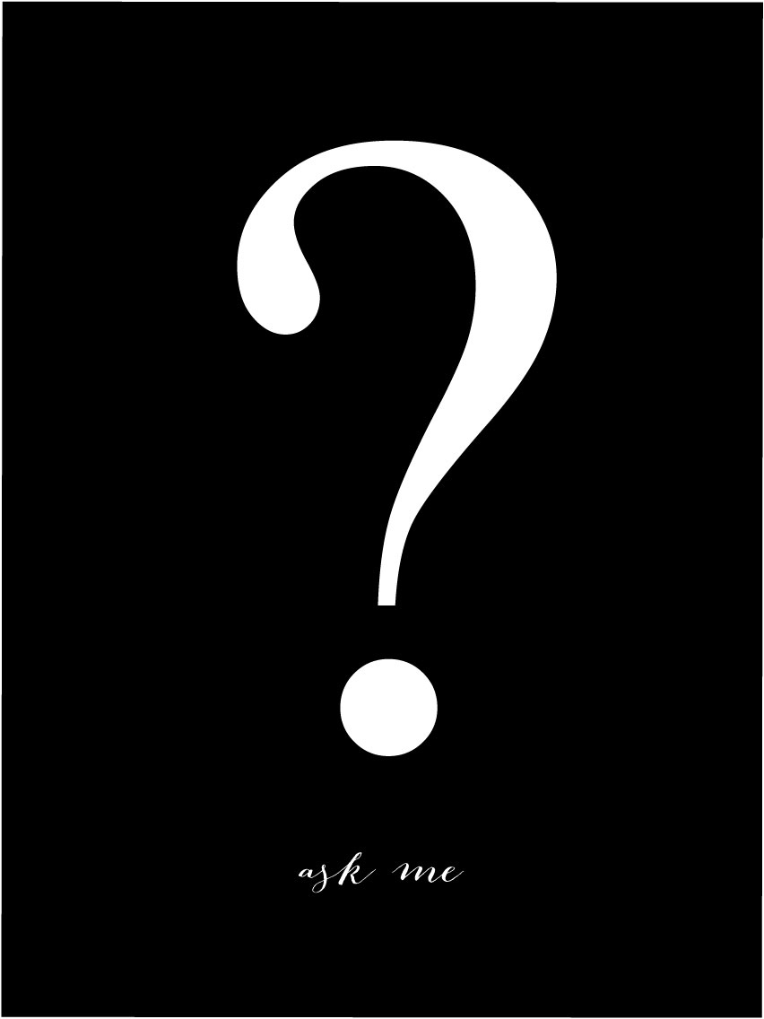 Feuille graphique épurée, Ask me, avec texte et un grand point d'interrogation en typographie blanche sur fond noir. Joli en combinaison avec d'autres affiches sur un mur de tableaux dans le salon, ou pour laisser savoir à vos invités que vous êtes une personne ouverte dès l'entrée. L'affiche est belle en combinaison avec les autres motifs typographiques de la même série - Ask me, Do me ou Share me.