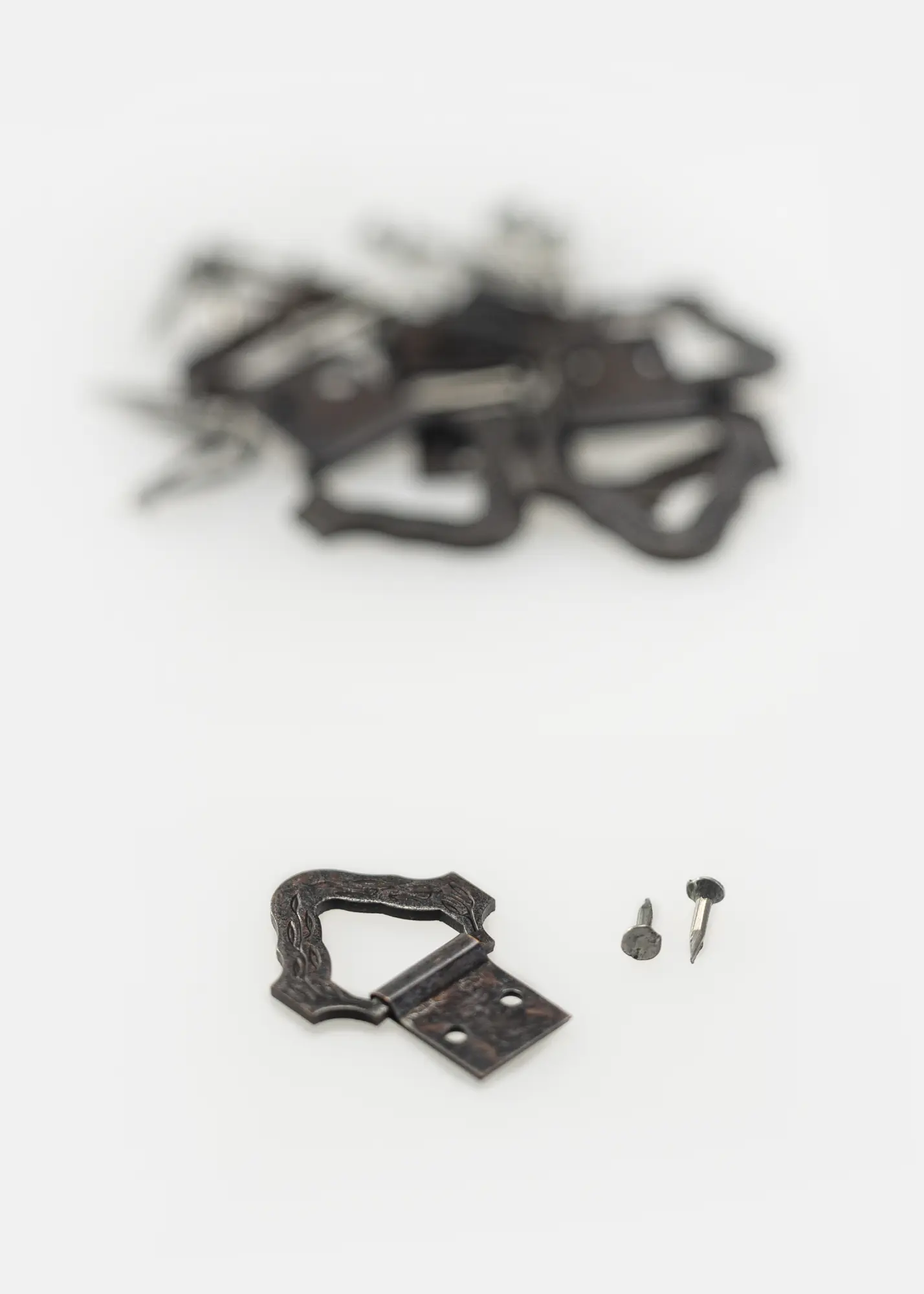 Un crochet triangle un peu plus exclusif qui est cloué à l'arrière du cadre. Parfait pour les cadres plus anciens et légèrement plus fins. Le crochet est fait pour être visible au-dessus du cadre lorsque vous accrochez le cadre. Vous choisissez si vous utilisez un ou deux crochets. Celui-ci est fait pour des cadres légèrement plus légers (taille maximale du cadre: 50x60 cm).