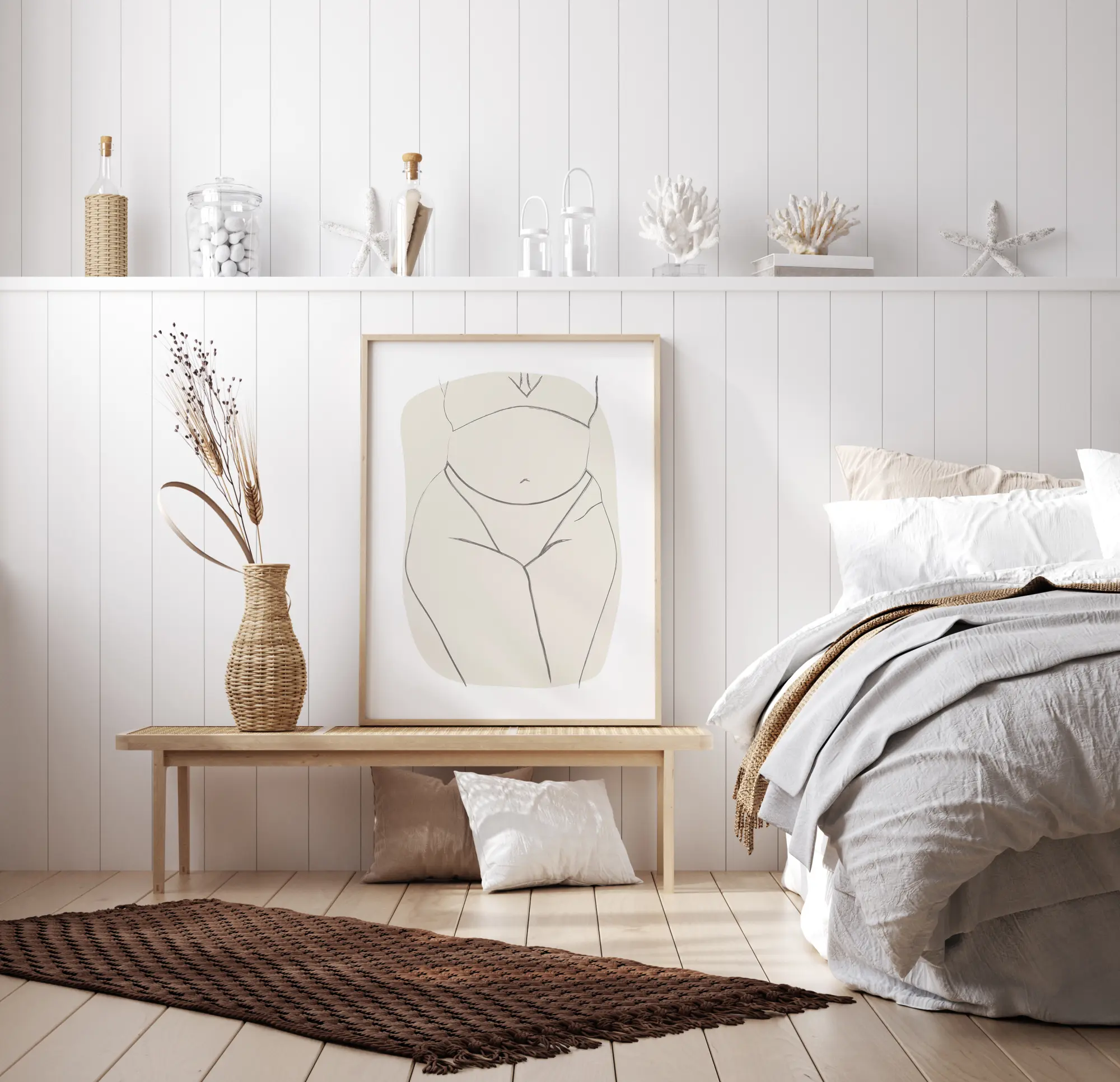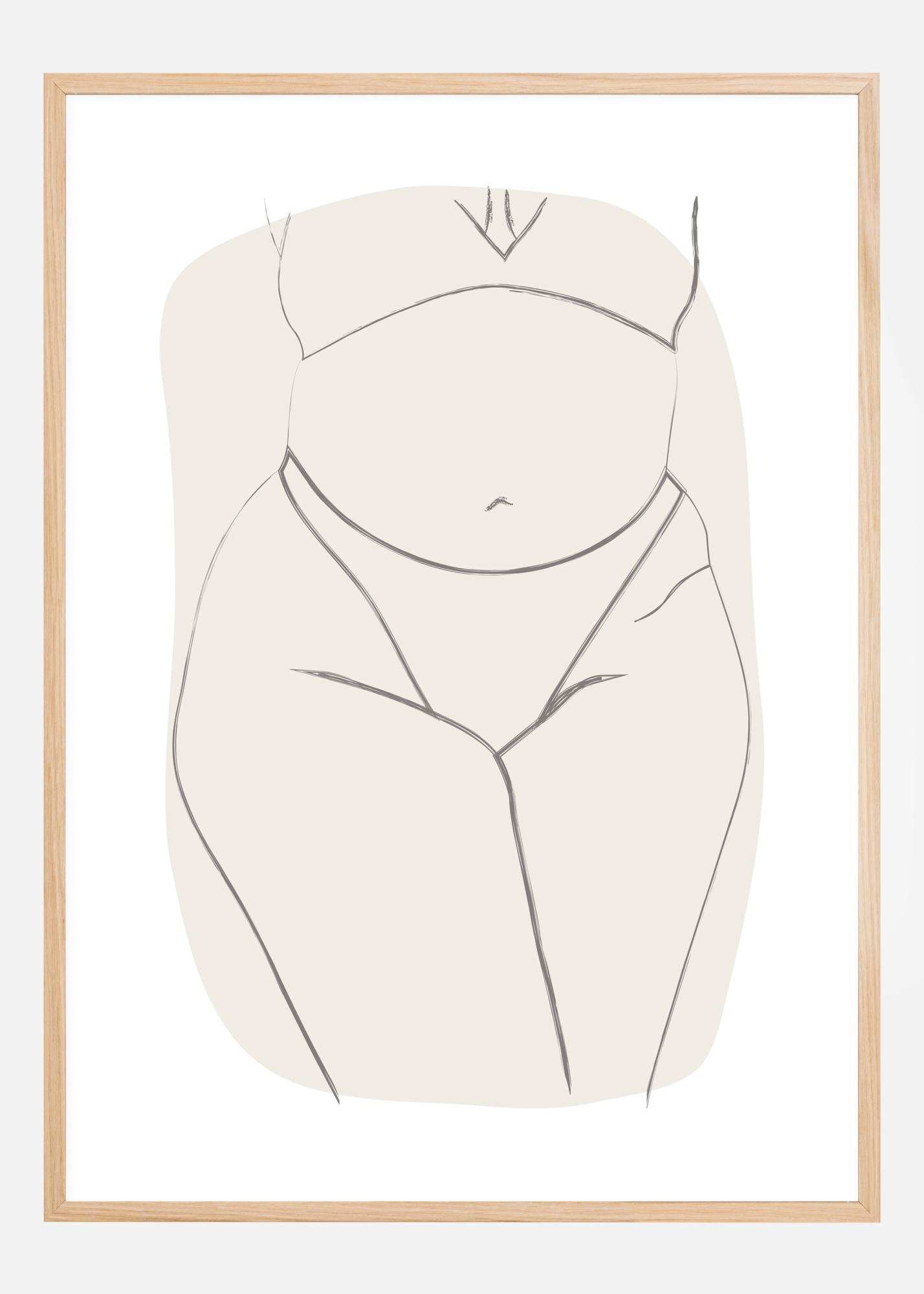 Une affiche simple d'un dessin du ventre et des jambes d'une femme. Dans une position modeste, les lignes montrent les jambes croisées de la femme qui porte un simple bikini. Soulignées de gris clair, les lignes fortes ressortent pour créer un travail d'artiste. Associez-les à un mur coloré pour obtenir une déco exceptionnelle.