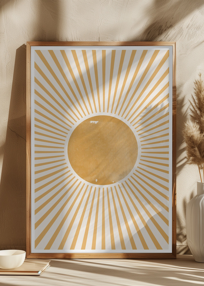 Cette affiche vive évoque la sensation d'un soleil éclatant avec ses lignes rayonnantes en tons dorés entourant un cercle central jaune sur un fond blanc doux. Le design est inspiré par des motifs bohèmes et géométriques, qui ensemble créent une image de la chaleur et de l'énergie du soleil. Les couleurs chaudes et le motif rayonnant sont conçus pour donner un sentiment de joie et de positivité.