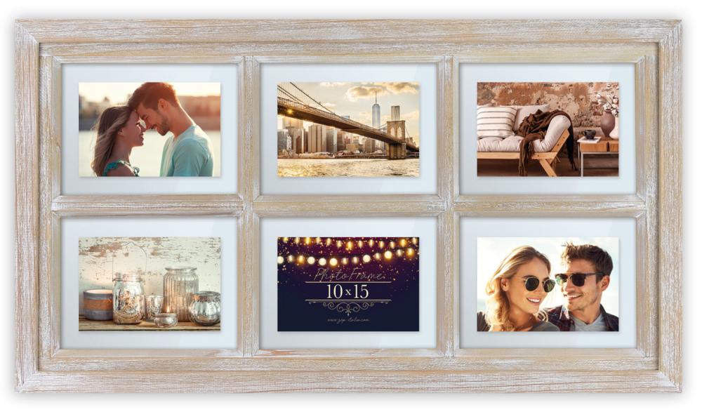 Cadre multivues de format horizontale en bois clair. Voici un cadre qui peut contenir 6 photos avec un format d'image en 10x15 cm, et qui vous permet de créer facilement un groupe d'images, rassemblées dans un même joli espace . Le cadre présente des petites variations naturelles du bois ce qui lui apporte un caractère rustique et rural. Les dimensions intérieures du cadre sont de 38,5x69,5 cm. Supports muraux inclus.