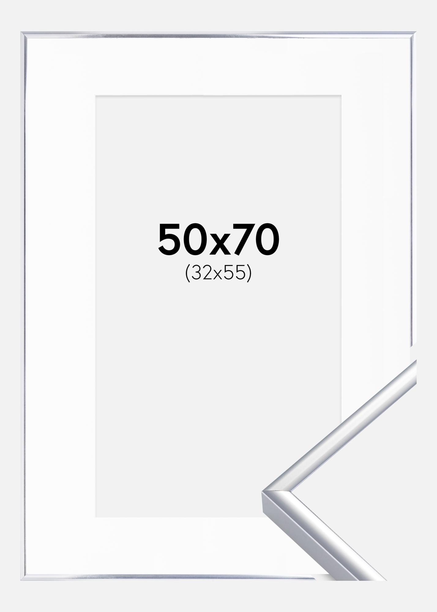 Cadre Aluminium Brillant Argent 50x70 cm - Passe-partout Blanc 33x56 cm
