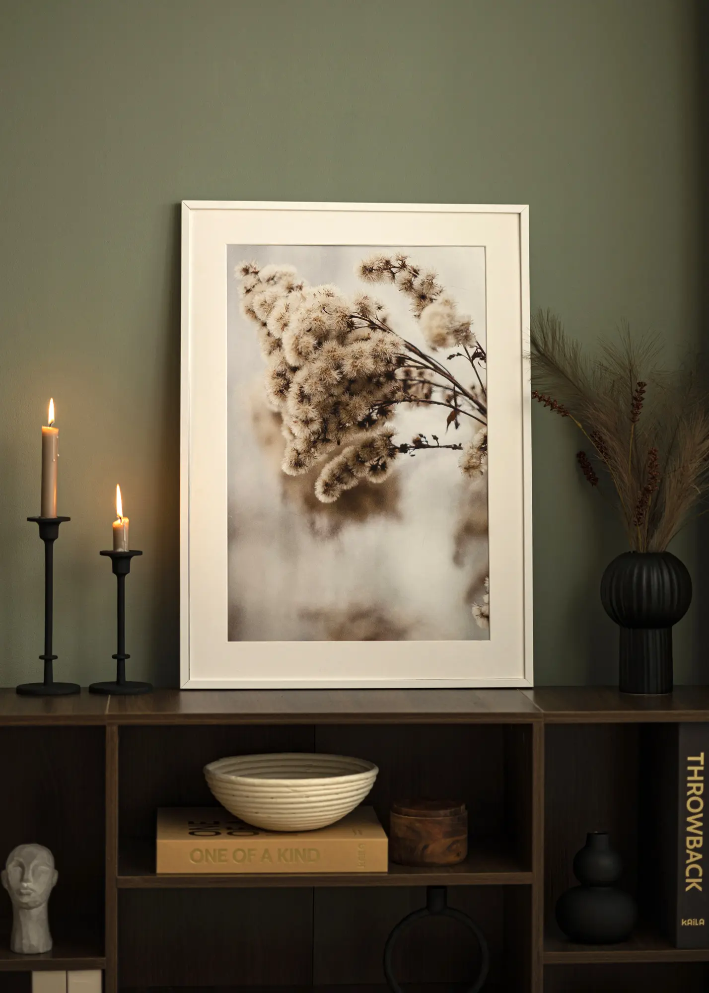 Forfait comprenant le cadre photo et le passe-partout blanc assorti. Sur la photo du produit, vous pouvez voir les dimensions du cadre (indiquées en gras) et les dimensions intérieures du passe-partout (indiquées entre parenthèses). Notez que les dimensions intérieures du passe-partout se doivent d'être toujours 1 cm inférieures par rapport à la taille de l'image que vous souhaitez encadrer.