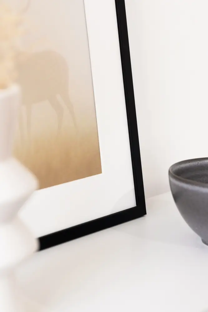 Edsbyn svart est un cadre de qualité de fabrication suédoise en véritable bois d'ayous. Le cadre est peint en noir ce qui lui donne un look moderne et intemporel, une caractéristique également renforcée par son profil carré. La baguette de cadre mesure 13 mm de large et 11,5 mm de profondeur, ce qui signifie que le cadre est fin tout en restant solide et stable. Support mural pour suspension verticale et horizontale inclus. Le cadre a une profondeur de baguette (profondeur intérieure) de 8 mm et dispose de beaucoup d'espace si vous souhaitez compléter votre motif avec un élégant passe-partout. La pièce de fond est en MDF et est maintenue en place à l'aide de petits têtes métalliques qui se plient facilement lorsque vous souhaitez y mettre votre motif.