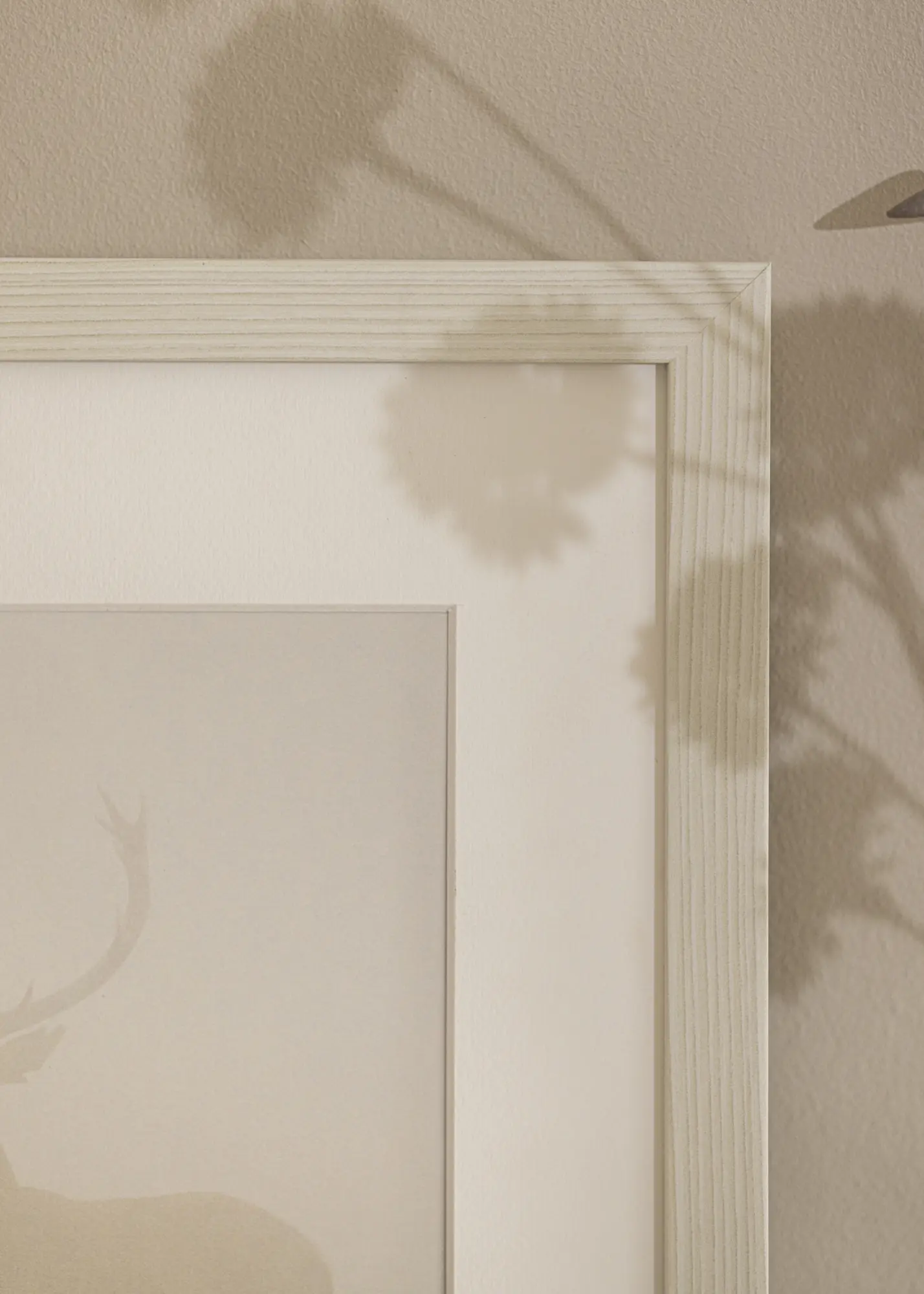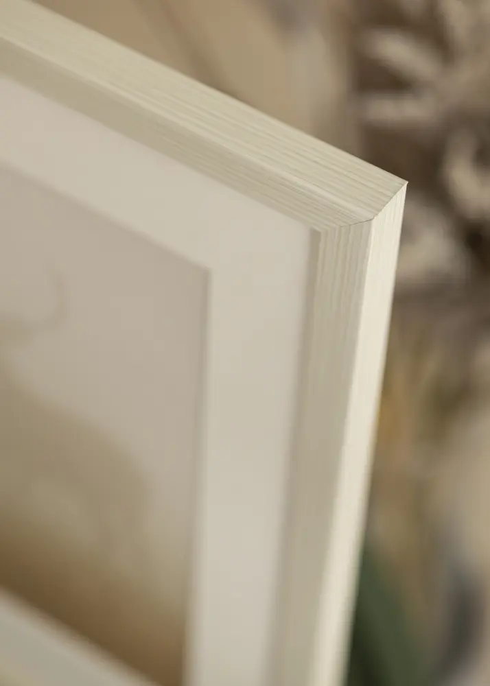 Forfait comprenant le cadre photo et le passe-partout blanc assorti. Sur la photo du produit, vous pouvez voir les dimensions du cadre (indiquées en gras) et les dimensions intérieures du passe-partout (indiquées entre parenthèses). Notez que les dimensions intérieures du passe-partout se doivent d'être toujours 1 cm inférieures par rapport à la taille de l'image que vous souhaitez encadrer.