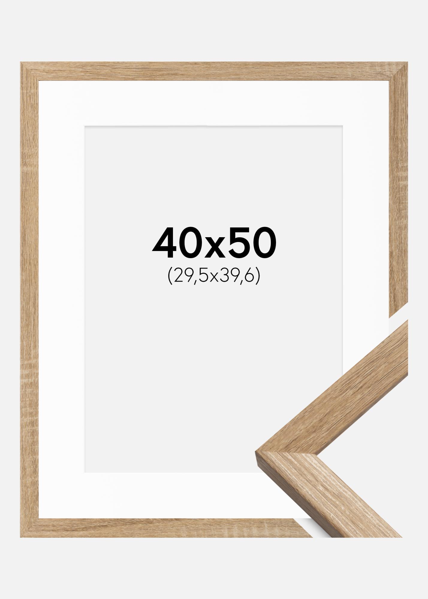 Forfait comprenant le cadre photo et le passe-partout blanc assorti. Sur la photo du produit, vous pouvez voir les dimensions du cadre (indiquées en gras) et les dimensions intérieures du passe-partout (indiquées entre parenthèses). Notez que les dimensions intérieures du passe-partout se doivent d'être toujours 1 cm inférieures par rapport à la taille de l'image que vous souhaitez encadrer.