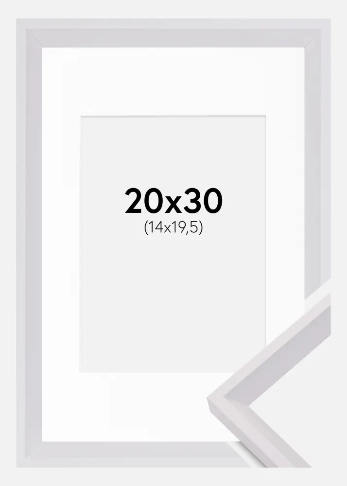 Forfait comprenant le cadre photo et le passe-partout blanc assorti. Sur la photo du produit, vous pouvez voir les dimensions du cadre (indiquées en gras) et les dimensions intérieures du passe-partout (indiquées entre parenthèses). Notez que les dimensions intérieures du passe-partout se doivent d'être toujours 1 cm inférieures par rapport à la taille de l'image que vous souhaitez encadrer.