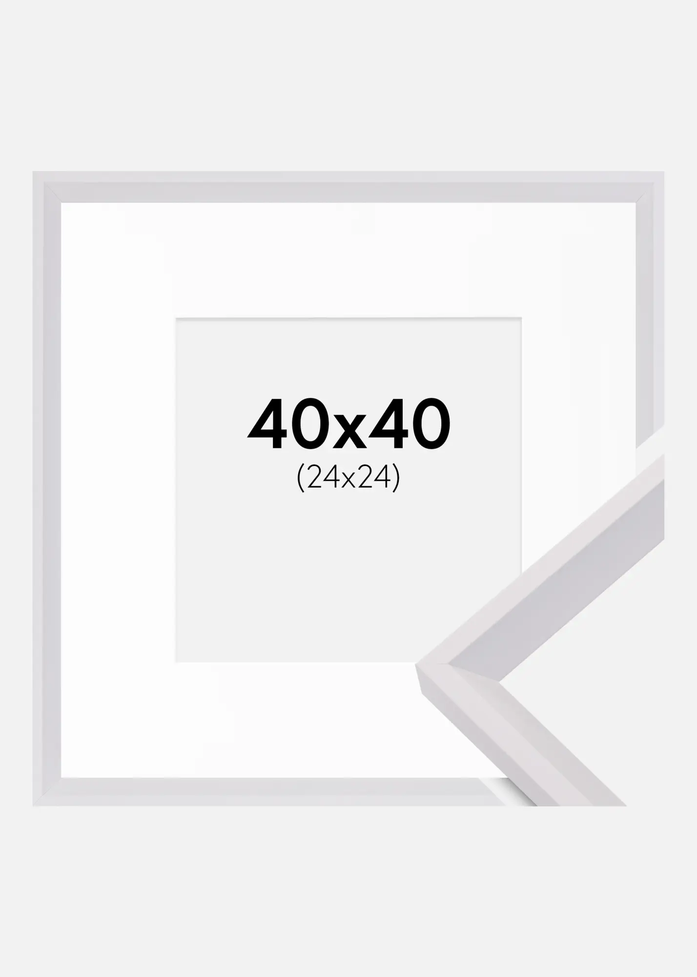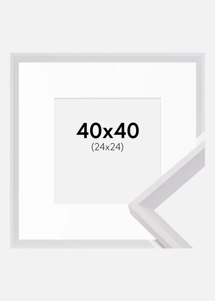 Forfait comprenant le cadre photo et le passe-partout blanc assorti. Sur la photo du produit, vous pouvez voir les dimensions du cadre (indiquées en gras) et les dimensions intérieures du passe-partout (indiquées entre parenthèses). Notez que les dimensions intérieures du passe-partout se doivent d'être toujours 1 cm inférieures par rapport à la taille de l'image que vous souhaitez encadrer.