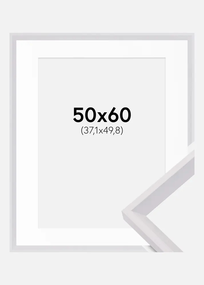 Forfait comprenant le cadre photo et le passe-partout blanc assorti. Sur la photo du produit, vous pouvez voir les dimensions du cadre (indiquées en gras) et les dimensions intérieures du passe-partout (indiquées entre parenthèses). Notez que les dimensions intérieures du passe-partout se doivent d'être toujours 1 cm inférieures par rapport à la taille de l'image que vous souhaitez encadrer.