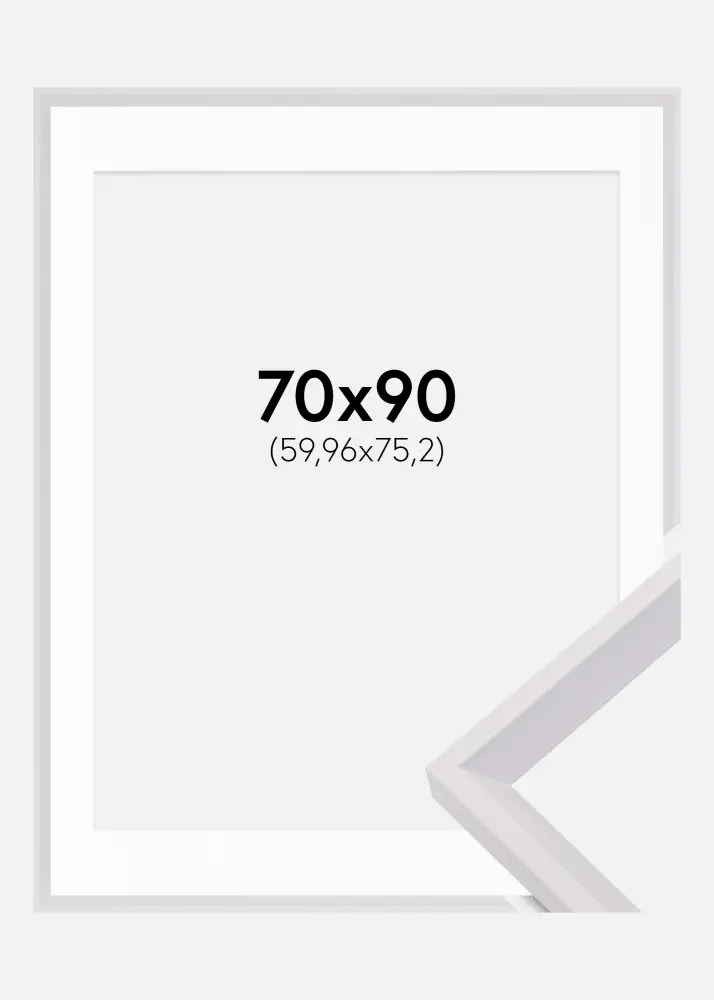 Forfait comprenant le cadre photo et le passe-partout blanc assorti. Sur la photo du produit, vous pouvez voir les dimensions du cadre (indiquées en gras) et les dimensions intérieures du passe-partout (indiquées entre parenthèses). Notez que les dimensions intérieures du passe-partout se doivent d'être toujours 1 cm inférieures par rapport à la taille de l'image que vous souhaitez encadrer.