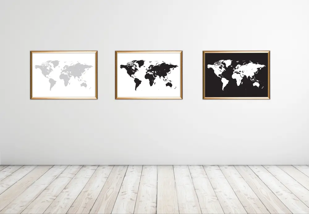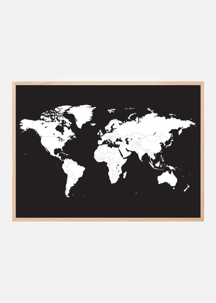 Superbe affiche graphique d'une carte du monde blanche sur un fond noir. L'affiche devient un point focal sur le mur avec son contraste net dans le motif et elle s'adapte bien pour être utilisée sur un mur de cadres avec d'autres prints graphiques ou des images en noir et blanc de destinations célèbres. Encadrez le print avec un cadre qui correspond au reste de la décoration de la pièce pour créer une sensation d'unité et permettre à l'image de s'exprimer pleinement.