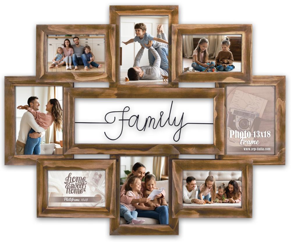 Ce joli cadre multivues est idéal pour développer vos meilleurs souvenirs de famille et les encadrer ! Le cadre multivues se présente dans une teinte chaude de bois brun et au milieu des cadres est inscrit le mot "family" en lettres capitales noires. Le cadre a de l'espace pour 8 images aux formats 10x15 cm et 13x18 cm. Supports muraux inclus.