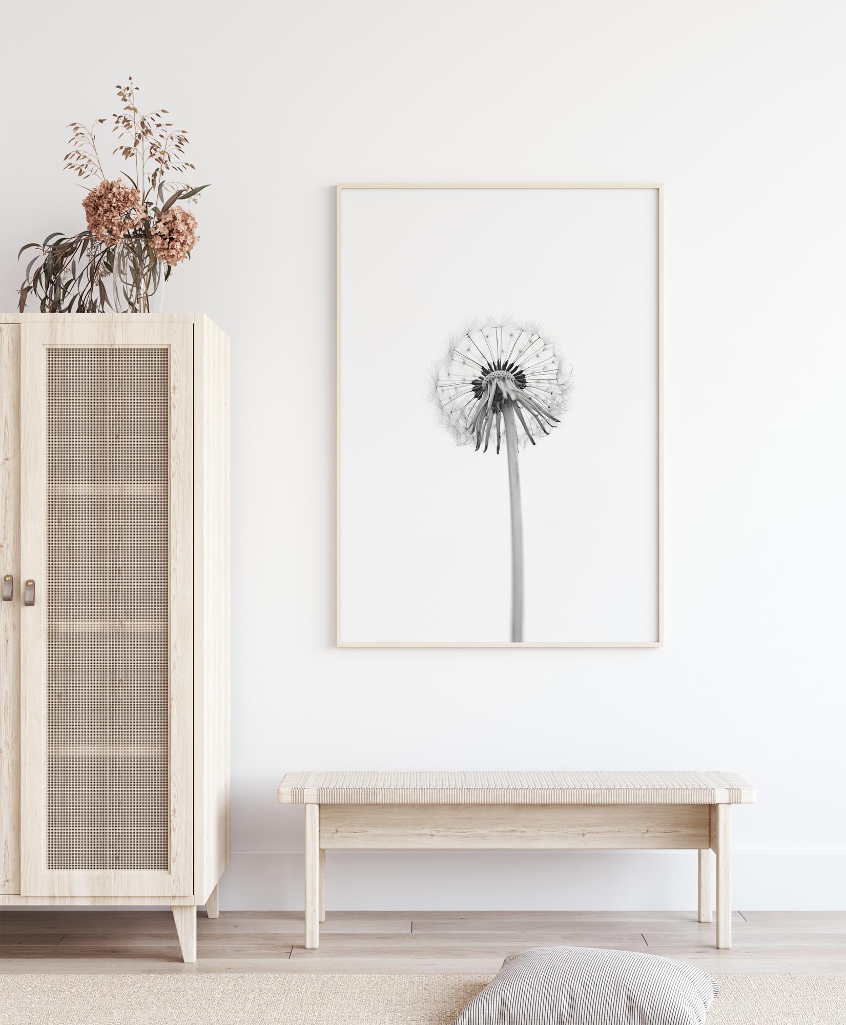Une affiche de nature claire et nette représentant un pissenlit sur un fond blanc. Ce cliché à dominante blanche se détachera sur un mur bleu ou vert vibrant. C'est l'impression parfaite pour un mur de galerie.