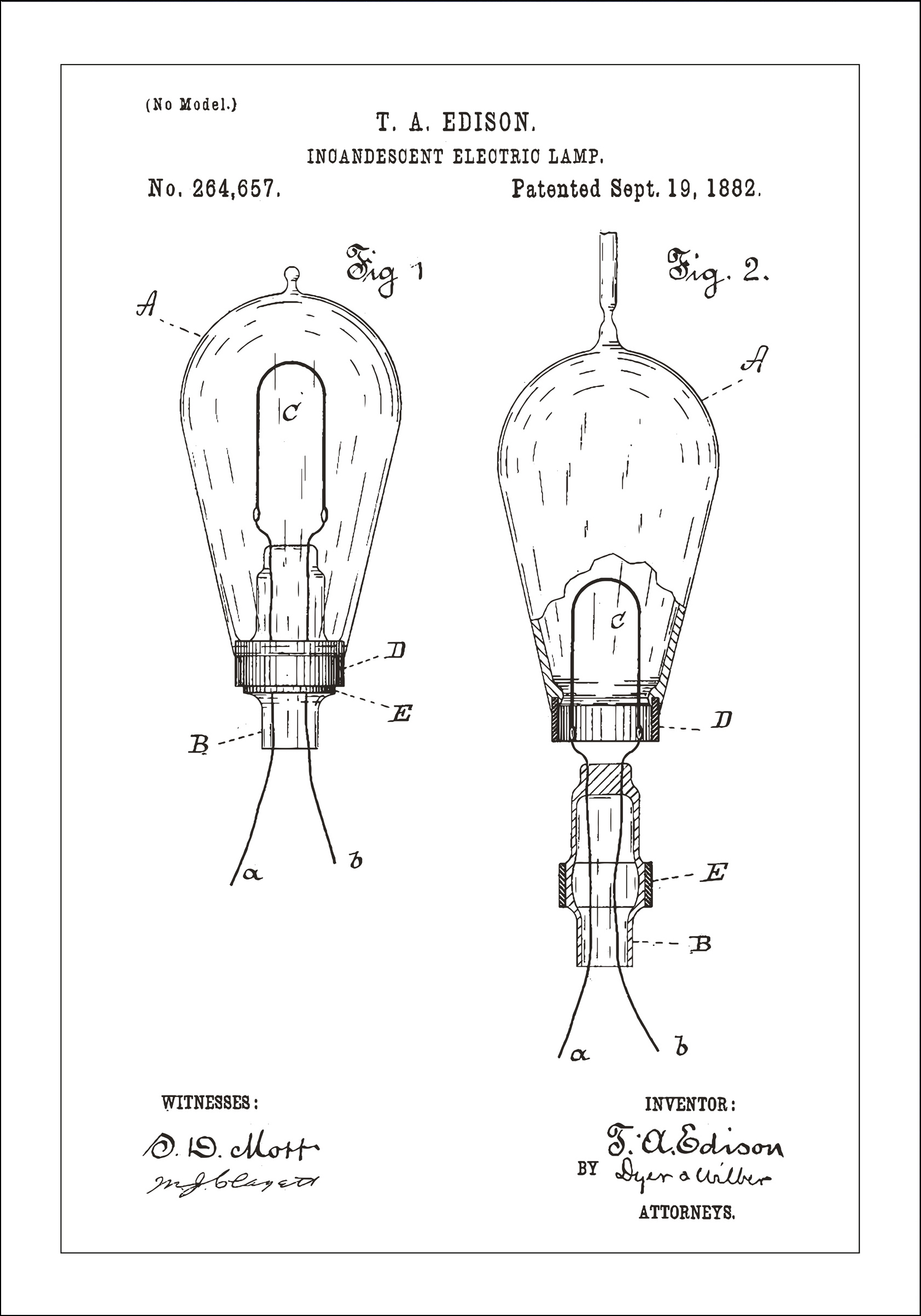 Cette affiche de brevet spécialement conçue révèle la beauté du design de l'ampoule de T. A. Edison, qui a façonné le monde moderne par le biais du brevet numéro 264,657, accordé le 19 septembre 1882. L'illustration détaillée met en lumière les aspects techniques d'une version précoce de l'ampoule électrique, qui fut l'une des premières à succès commercial. Cette affiche de brevet est un hommage parfait à l'un des inventeurs les plus influents de tous les temps et à sa contribution à l'éclairage électrique.