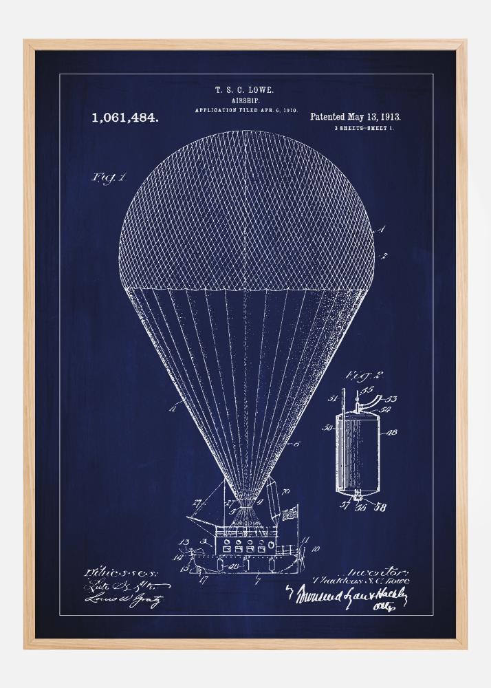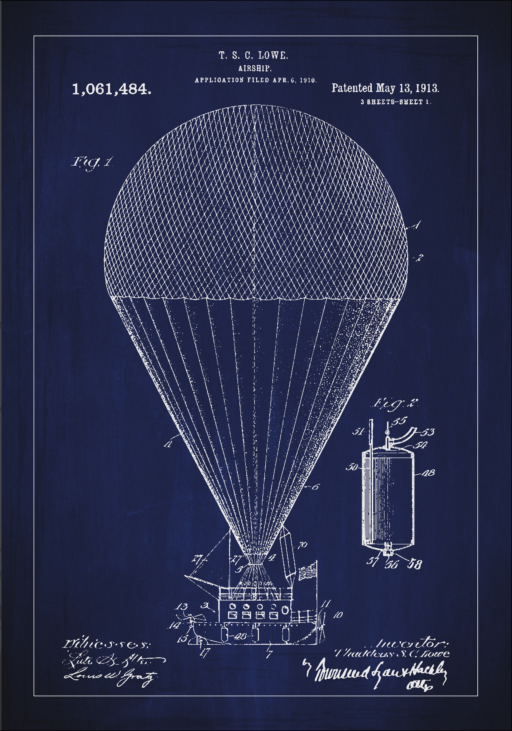 Nous avons le plaisir de vous présenter cette affiche de brevet représentant le dirigeable de T. S. Lowe, une invention qui a marqué un progrès dans l'aviation précoce. Le brevet, numéro 1,061,484, a été accordé le 13 mai 1913 et transporte avec lui une époque d'aventure et d'innovation. Cette affiche est un hommage à l'esprit créatif et aux rêves techniques du début du XXe siècle.