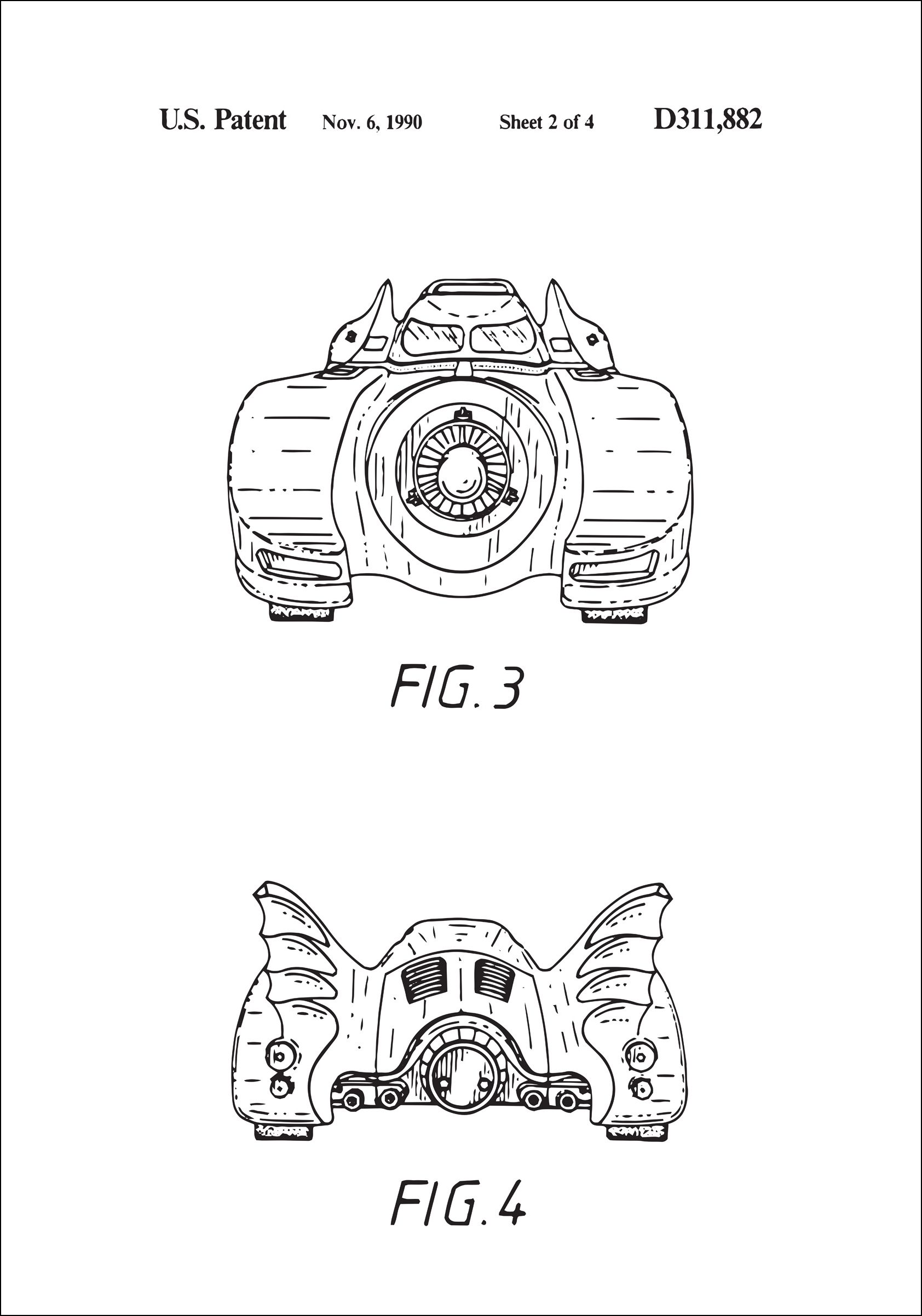 Notre collection d'affiches de brevets est complétée par cette illustration captivante, qui présente deux perspectives d'un design révolutionnaire de la voiture de Batman. Les détails du dessin de brevet, numéro de référence D311,882 du 6 novembre 1990, démontrent l'esthétique unique et la finesse technique de l'invention. Ces images ne sont pas seulement un document historique mais aussi un hommage aux progrès créatifs qui caractérisent notre développement technologique. Idéal pour apporter un élément de stimulation intellectuelle et d'intégrité artistique à tout environnement.