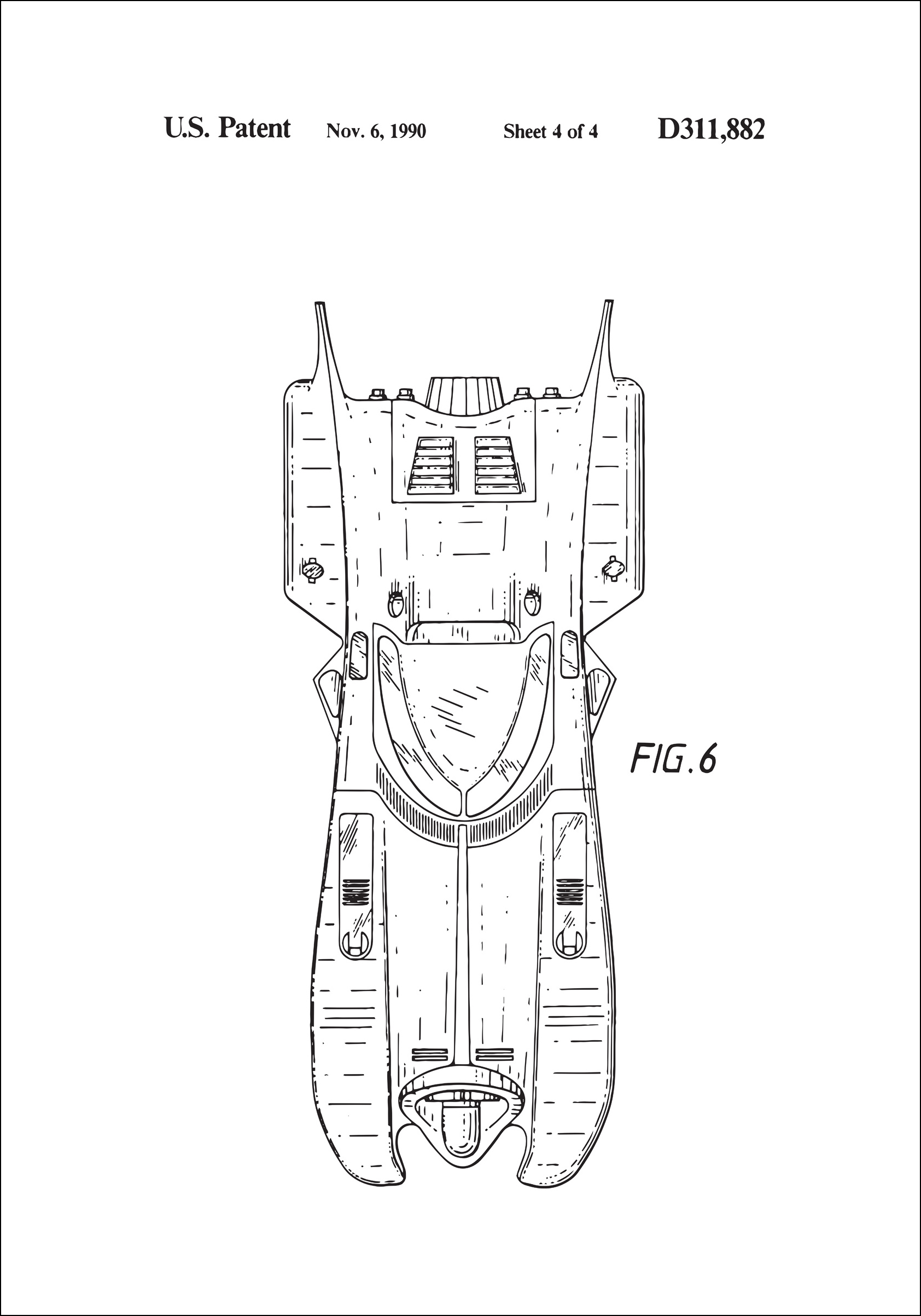 Ce dessin de brevet concerne le brevet américain numéro D311,882, daté du 6 novembre 1990, qui est montré sur le dessin lui-même. C'est un cadeau parfait pour les passionnés de technologie et d'histoire, ainsi que pour les inventeurs et designers professionnels qui apprécient l'artisanat détaillé nécessaire pour transformer une idée de concept en réalité. Cette affiche de brevet est un ajout sophistiqué à toutes maisons ou bureaux, et offre une esthétique intemporelle qui ne se démode jamais.
