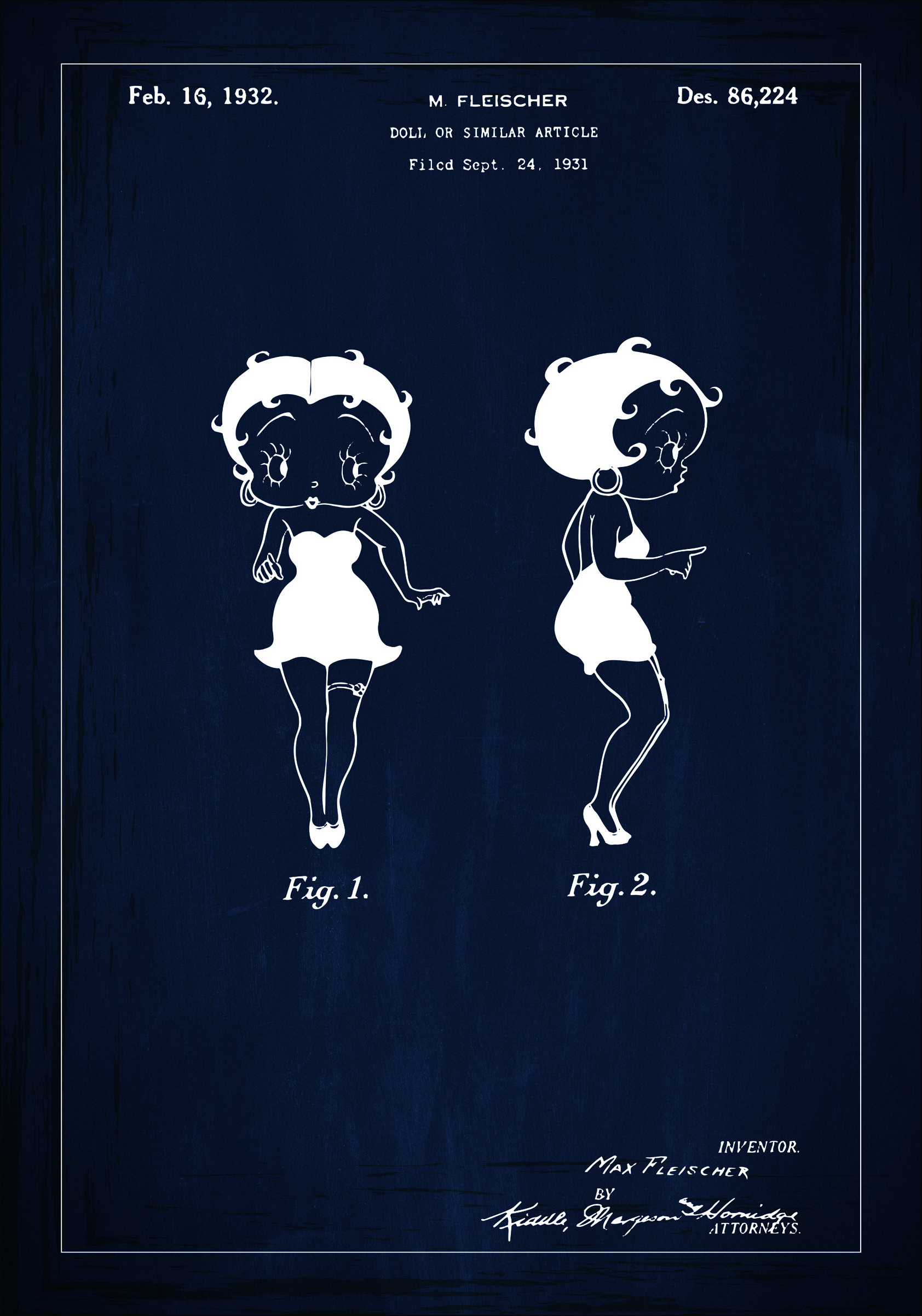 Ce poster de brevet du 16 février 1932 montre une poupée de Betty Boop, conçue par M. Fleischer. Le numéro de brevet est Des. 86,224, et la demande a été déposée le 24 septembre 1931. Sur cette illustration, nous voyons deux figures de la poupée; une de face et une de côté, ce qui dépeint les caractéristiques et la forme distinctives de la poupée.