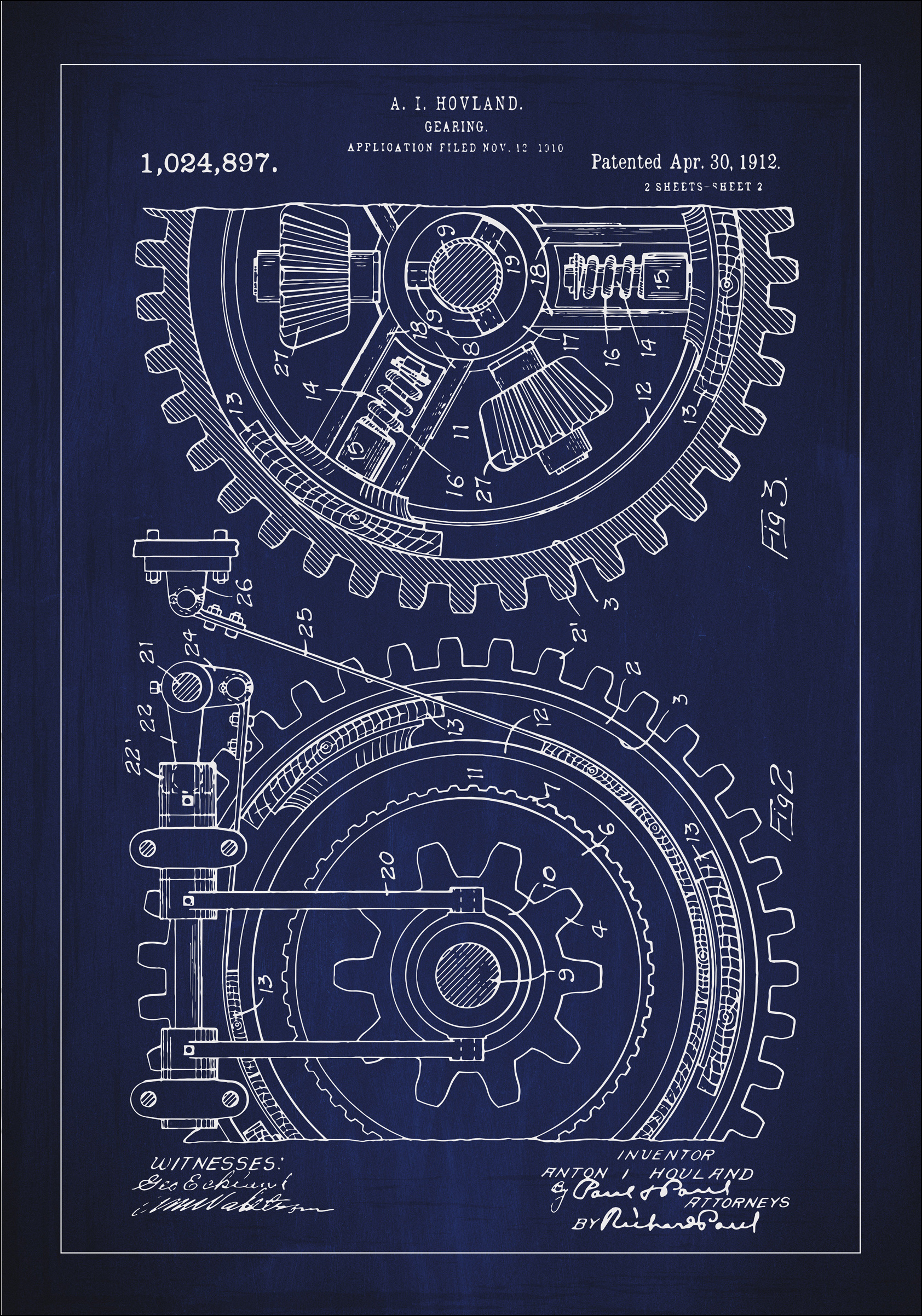 Décorez votre espace avec cette élégante affiche de brevet qui décrit en détail l'invention par A. I. Hovland d'un mécanisme de transmission, brevet numéro 1,024,897, accordé le 30 avril 1912. Ce travail complexe de dessin technique met en lumière une époque d'innovation et de construction mécanique. Avec ses contrastes audacieux et ses illustrations complexes, c'est un ajout enchanteur à un bureau d'ingénieur, un atelier, ou tout environnement industriel où la machinerie et le design sont hautement valorisés.