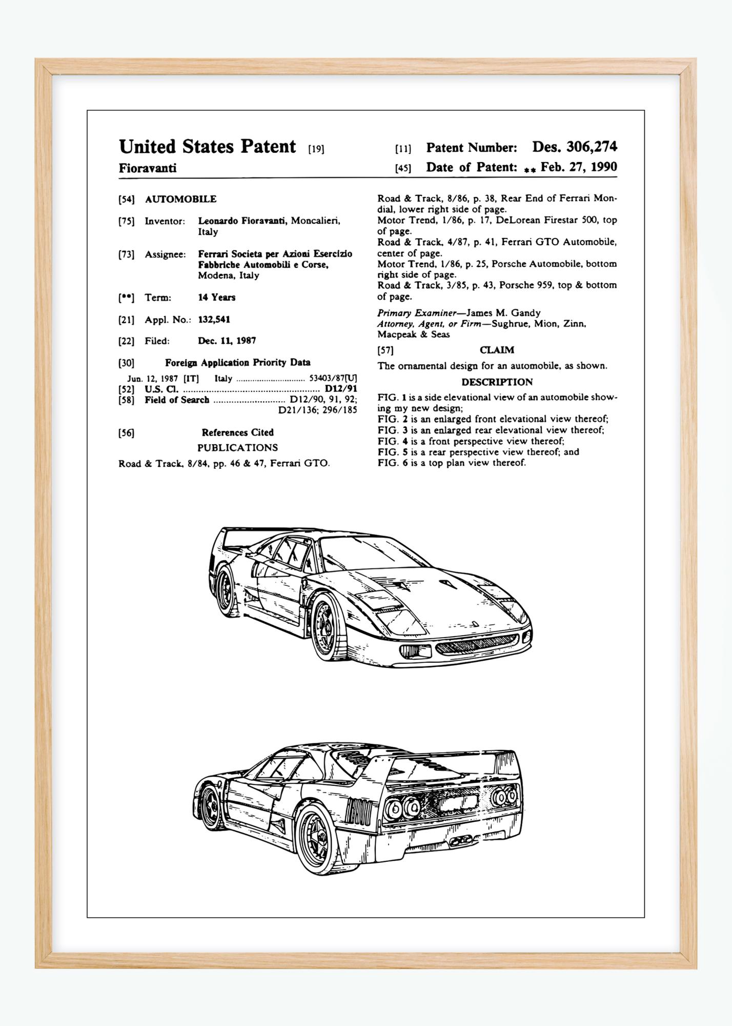 Cette élégante affiche de brevet montre une voiture conçue par Leonardo Fioravanti pour Ferrari, l'un des noms les plus emblématiques de l'industrie automobile. Accordé le 27 février 1990 sous le numéro de brevet Des. 306,274, le document représente le design esthétique d'une Ferrari F40 qui capture l'essence de la vitesse et de l'innovation. Les illustrations du brevet mettent en valeur les lignes frappantes et la silhouette aérodynamique qui sont devenues la marque de fabrique.