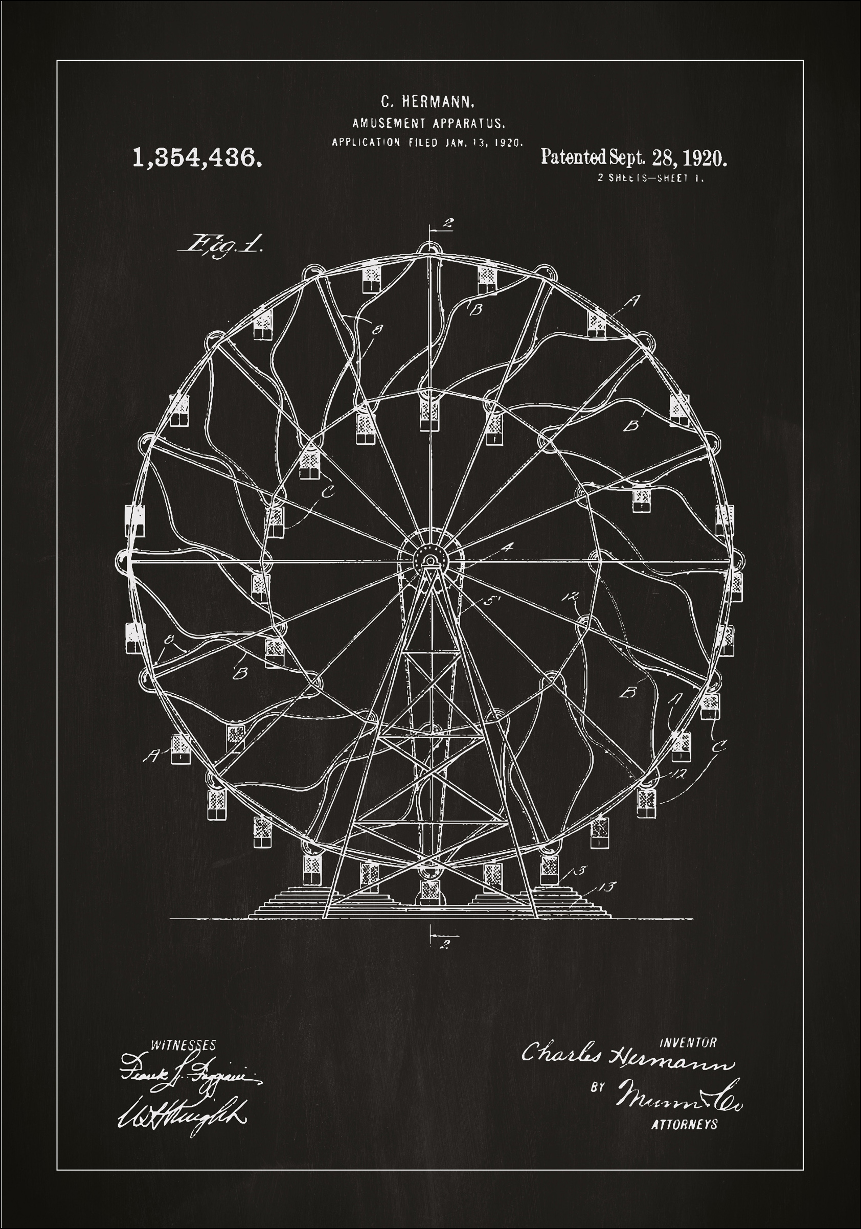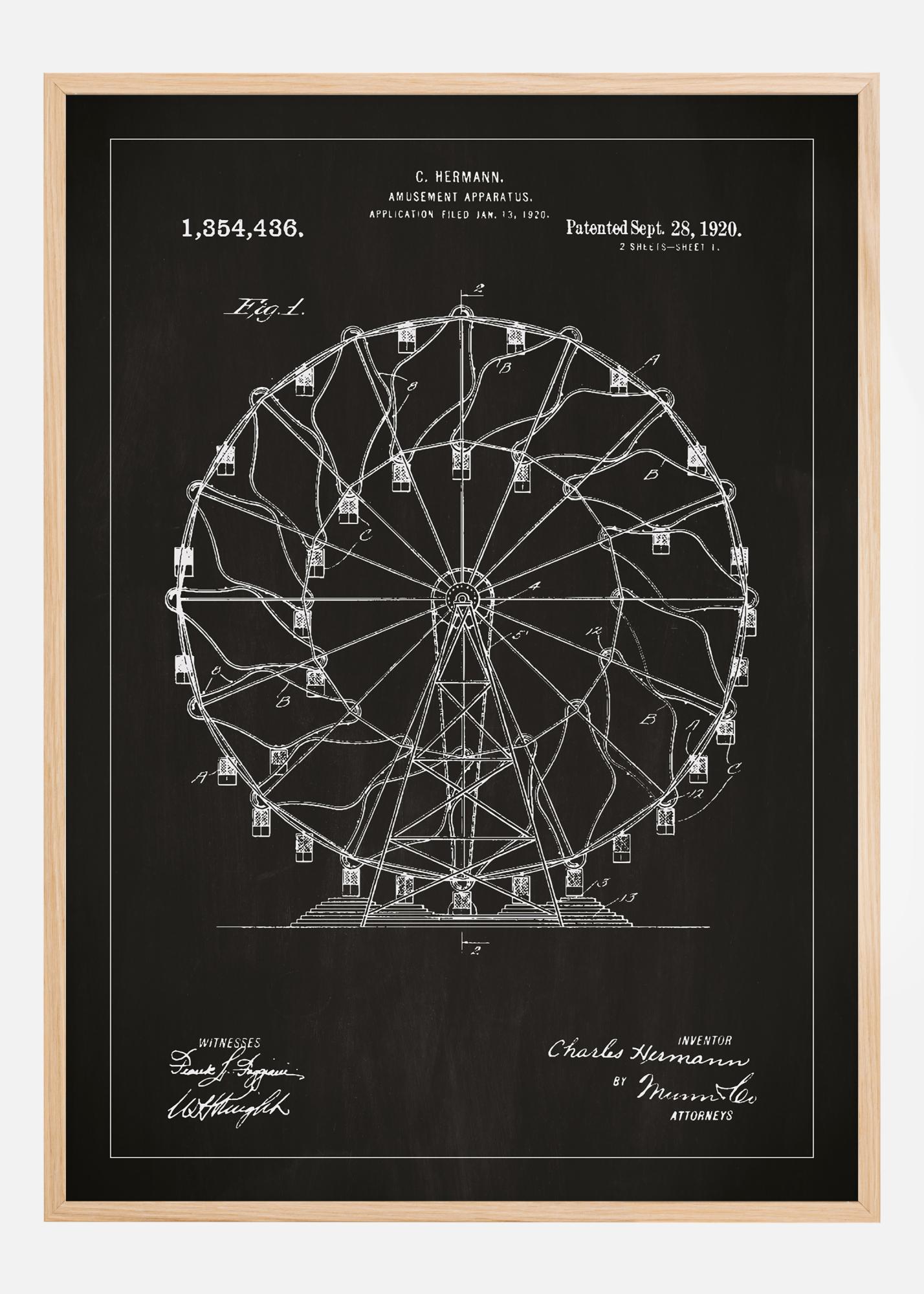 Ce poster de brevet présente la construction classique du parc d'attractions par C. Hermann, spécifiée dans le brevet numéro 1,354,436, délivré le 28 septembre 1920. Avec sa représentation détaillée d'une grande roue, ce dessin symbolise une époque d'innovation ludique et constitue un merveilleux élément de décoration pour quiconque a un cœur pour la vie récréative historique et la technologie. Le design intriqué et les détails minutieux attirent l'attention et procurent une sensation nostalgique.