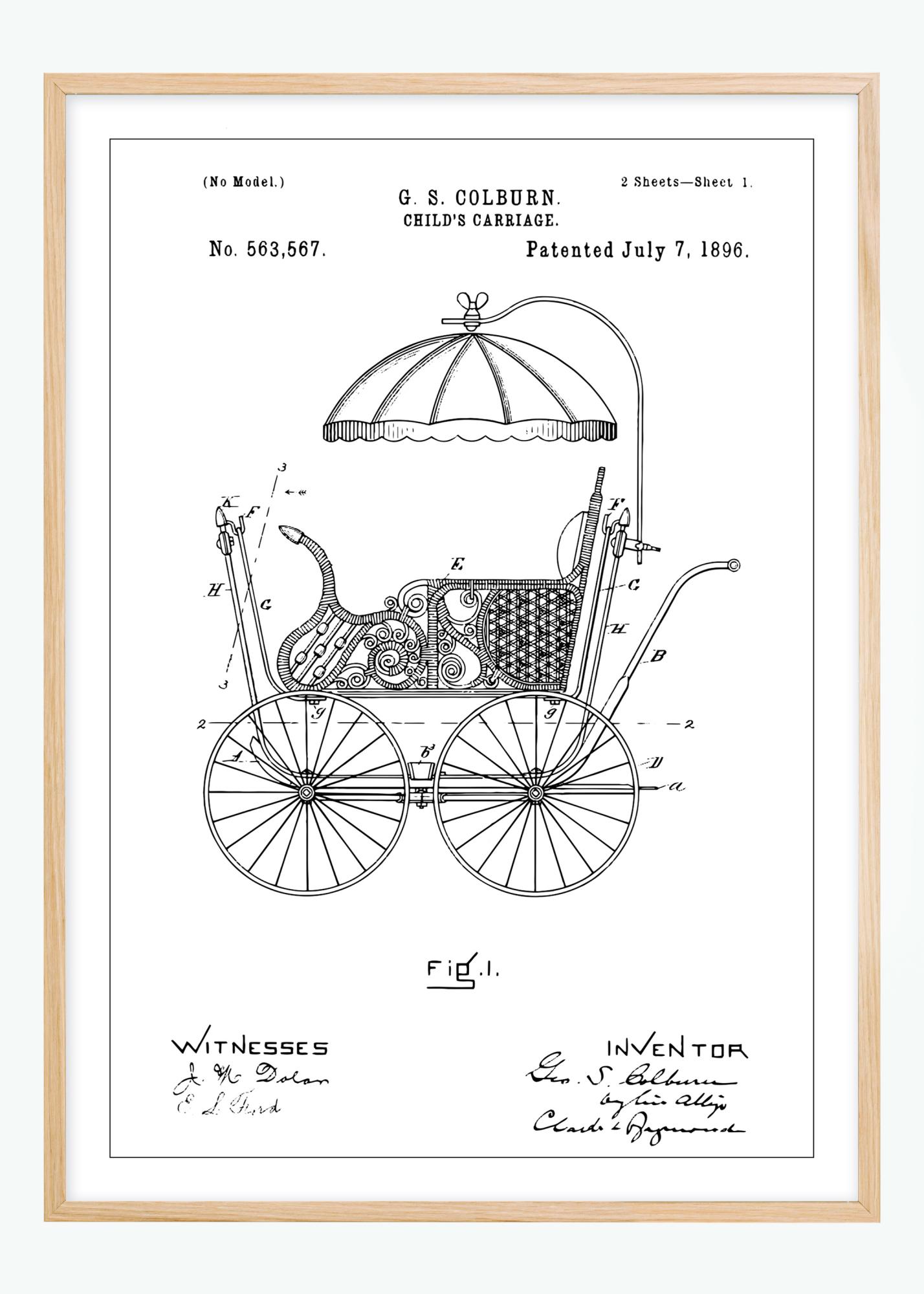 Cet affichage charmant de brevet représente une poussette de la fin des années 1800, numéro de brevet 563,567, accordé le 7 juillet 1896 à G.S. Colburn. La richesse des détails dans le dessin capture l'artisanat et l'inventivité de l'époque, faisant de cette affiche un article de décoration exquis pour tous ceux qui apprécient l'artisanat et le design historiques. L'illustration montre une poussette nostalgique, complète avec des roues pointues et un élégant auvent, reflétant l'élégance et le style d'une époque révolue.