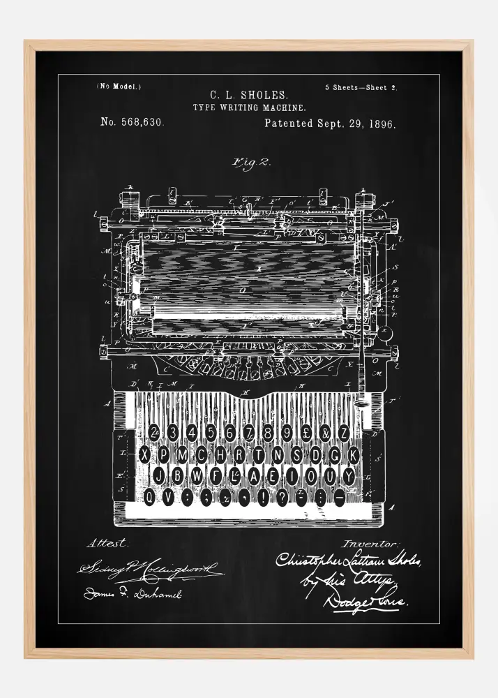 Cet affichage emblématique de brevet représente le brevet historique n° 568,630, attribué le 29 septembre 1896 à C. L. Sholes pour une machine à écrire. La majestueuse illustration montre la complexité mécanique d'une machine à écrire ancienne, complète avec la disposition des touches et les mécanismes internes. Des détails tels que le mécanisme typhoïde complexe et le clavier magnifiquement agencé se détachent contre le fond noir profond et donnent une sensation d'élégance vintage.