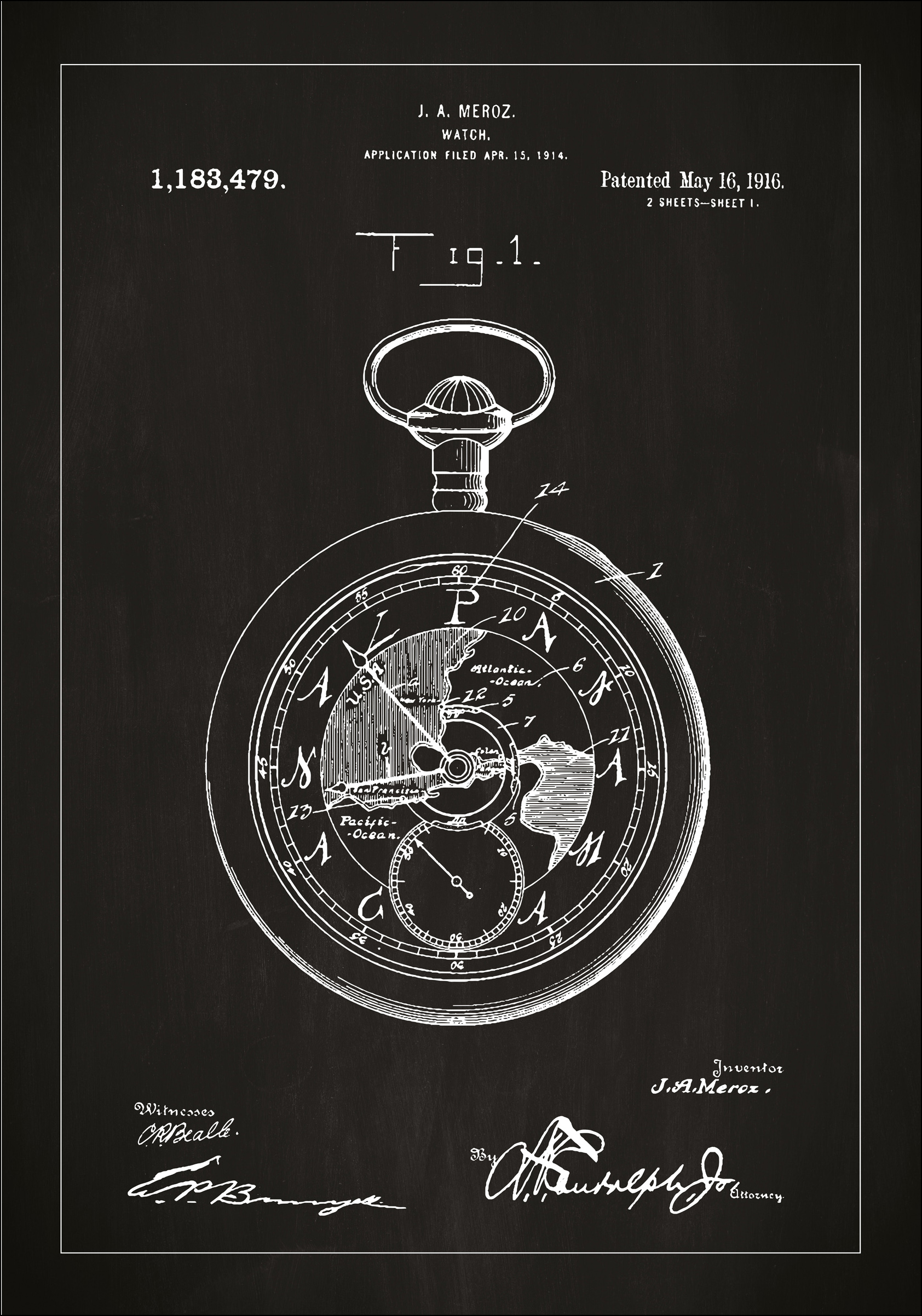Cette affiche de brevet sophistiquée dépeint l'invention intemporelle d'une montre de poche, brevetée par J.A. Meroz le 16 mai 1916, sous le numéro de brevet 1,183,479. Le dessin de brevet détaillé montre un design complexe du mécanisme de la montre, complet avec des détails mécaniques qui reflètent l'époque où la précision dans la mesure du temps est devenue une forme d'art en soi.