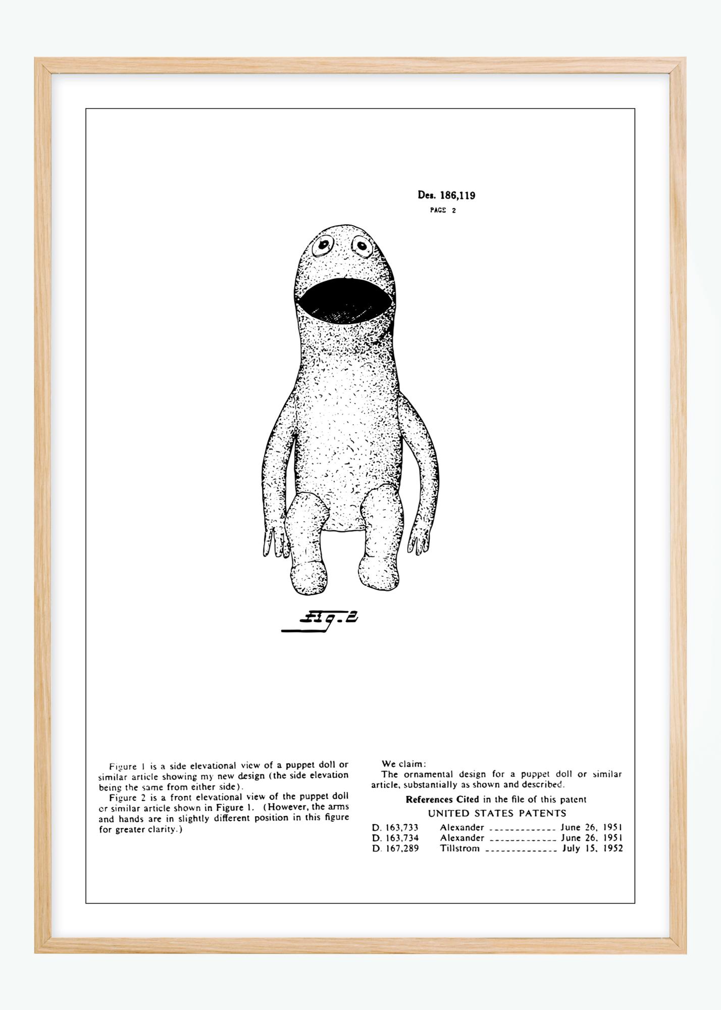 Cette affiche de brevet montre un jouet sur Kermit. Avec le numéro de brevet Des. 186 119, cette illustration est une documentation officielle d'une poupée avec une esthétique charmante et inhabituelle. La figure sur le dessin offre une vue frontale complète, mettant en valeur les détails et la forme de la poupée, et donne une impression de caractère et de personnalité qui peut être appréciée à la fois par les enfants et les adultes.