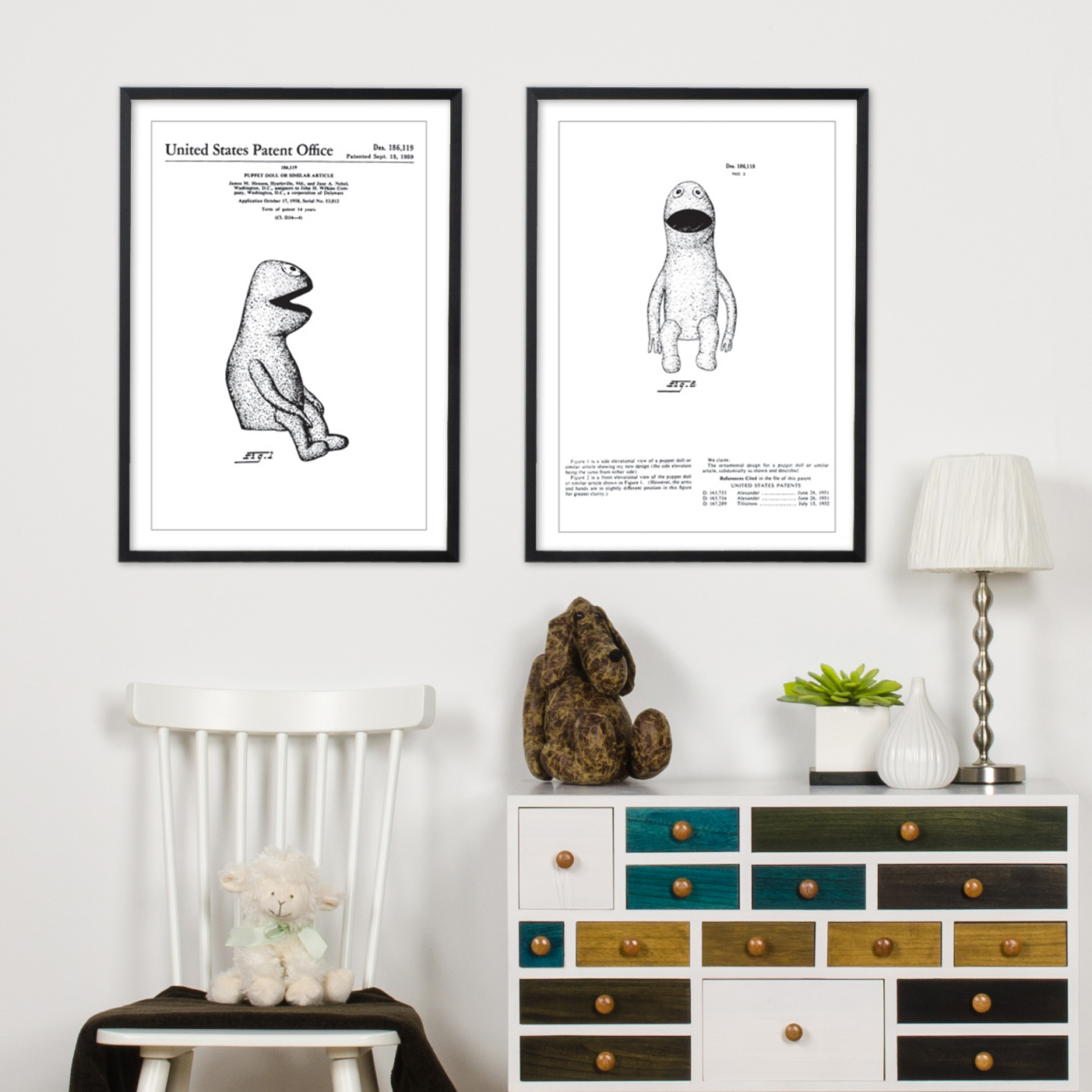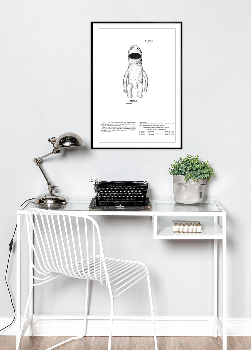 Cette affiche de brevet est une belle représentation du design de jouet du milieu du XXe siècle et serait un ajout attrayant à une chambre d'enfant, un espace de jeu ou un espace de collection de jouets historiques. Pour aider les acheteurs intéressés à trouver ce design particulier, des mots-clés tels que "brevet de poupée", "affiche de poupée vintage" et "dessin de design de jouet" peuvent être utilisés, reflétant tous le caractère unique et la valeur intemporelle de ce jouet.