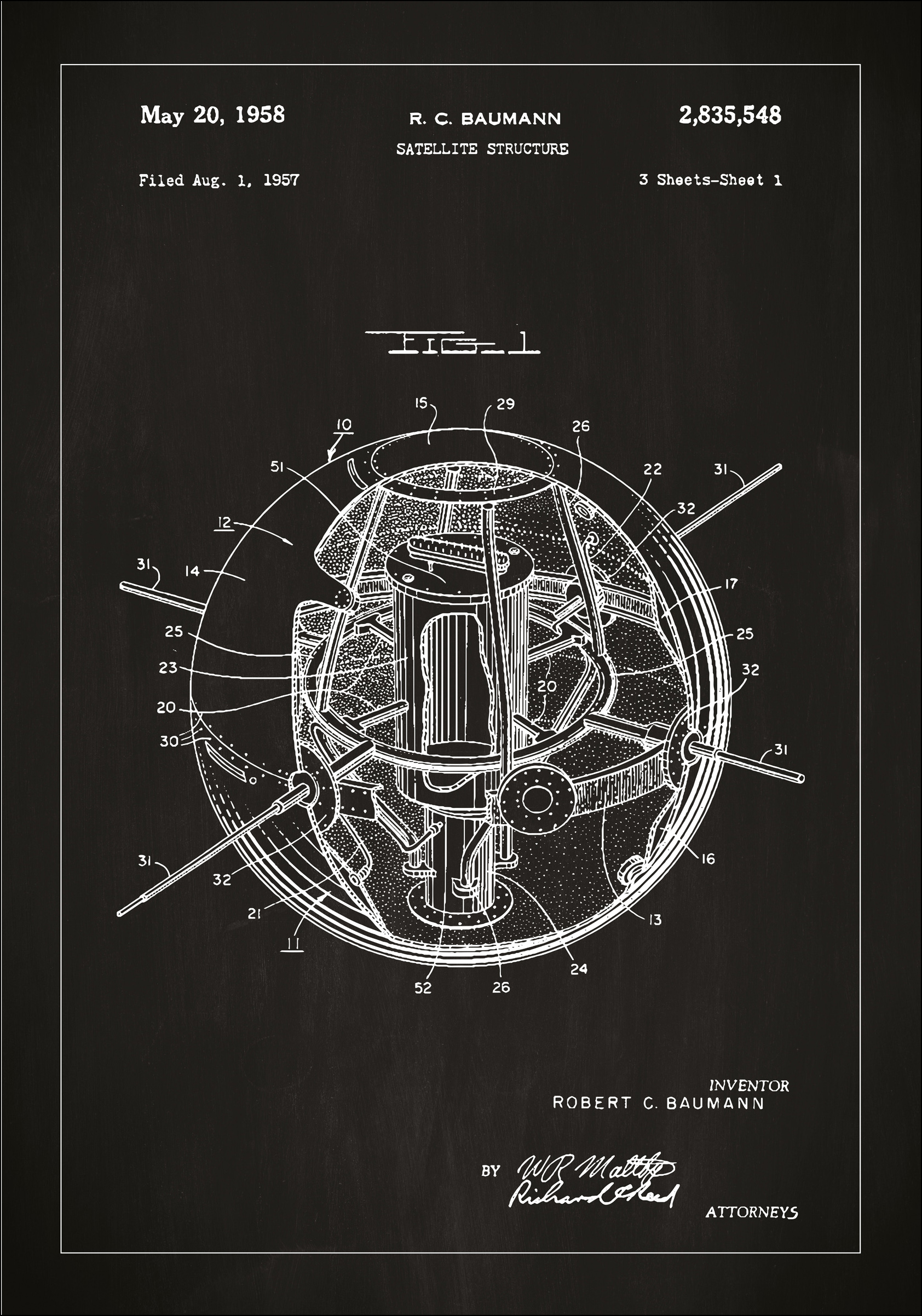 Cette affiche de brevet remarquable illustre une construction révolutionnaire à l'aube de la technologie spatiale : la "Satellite Structure" de R.C. Baumann, brevetée le 20 mai 1958, avec le numéro de brevet 2,835,548. Déposée le 1er août 1957, ce dessin de brevet détaillé montre un modèle précoce de satellite artificiel, complet avec ses composants et ses configurations géométriques uniques, révélant l'esprit innovateur de l'ère de la course à l'espace.
