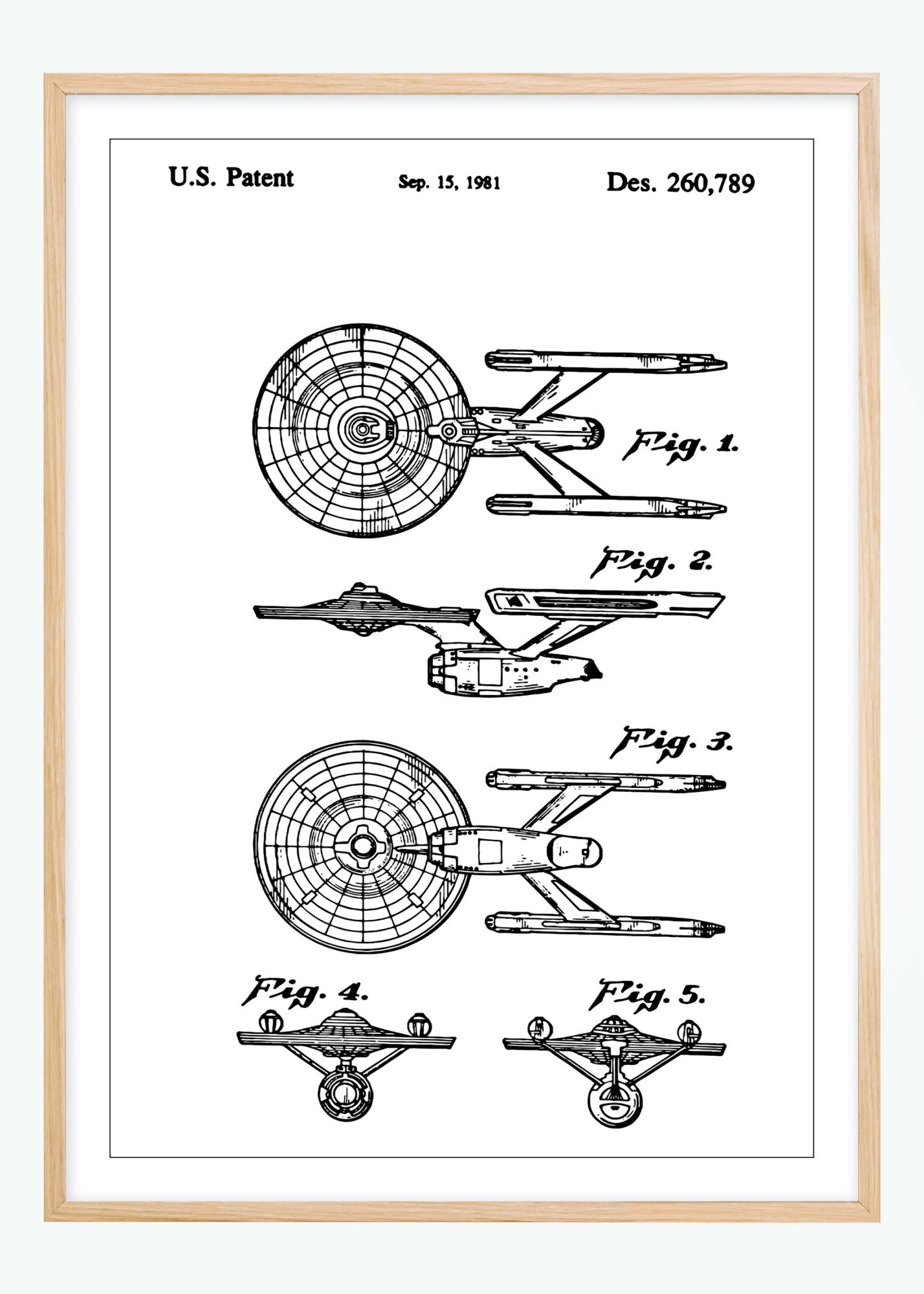 Cette affiche de brevet montre un dessin détaillé de l'Enterprise de StarTrek, brevet accordé le 15 septembre 1981 sous le numéro Des. 260,789. Les cinq figures illustrent le ventilateur sous différents angles, offrant une vue complète de sa construction et de son design. Les dessins mettent en valeur la structure technique et l'esthétique de cet appareil quotidien.