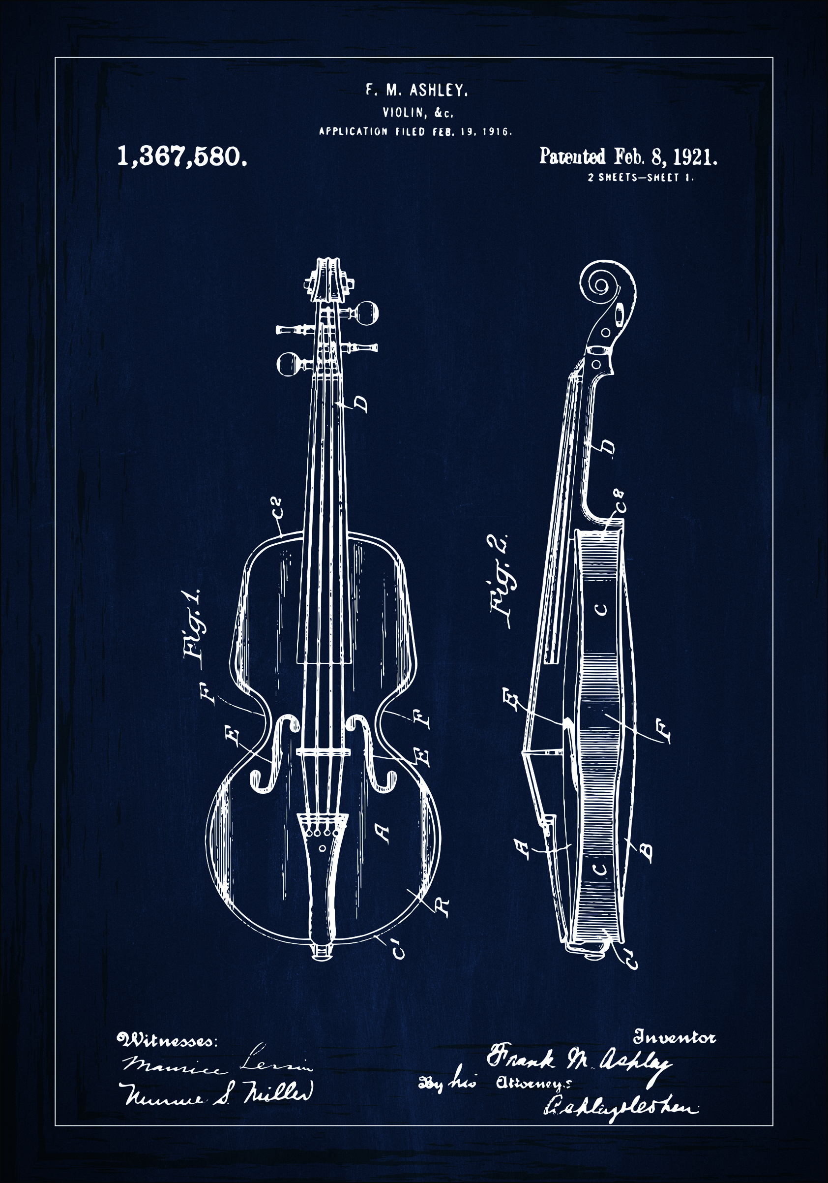 Ce panneau de brevet audacieux et distinct est une représentation du brevet numéro 1,367,580, accordé le 8 février 1921 à F. M. Ashley pour un violon, présenté sur un fond sophistiqué bleu marine. Avec ses illustrations aux lignes blanches se détachant contre le ton sombre, il offre un contraste qui capte l'œil et rehausse chaque détail de cet instrument à cordes, de la volute au cordier.