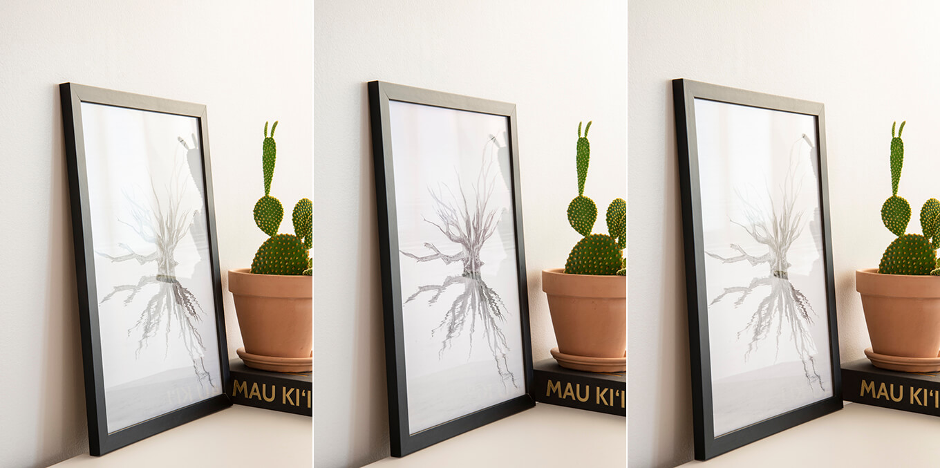 Le verre antireflet coûte un peu plus cher, mais c'est une alternative très populaire. Si vous ne souhaitez pas payer pour un verre antireflet pour tous les motifs, nous vous recommandons de prioriser les motifs qui se trouvent dans des endroits où il y aura probablement beaucoup de reflets, ou pour vos motifs préférés que vous voulez bien protéger et/ou que vous souhaitez toujours exposer clairement.
