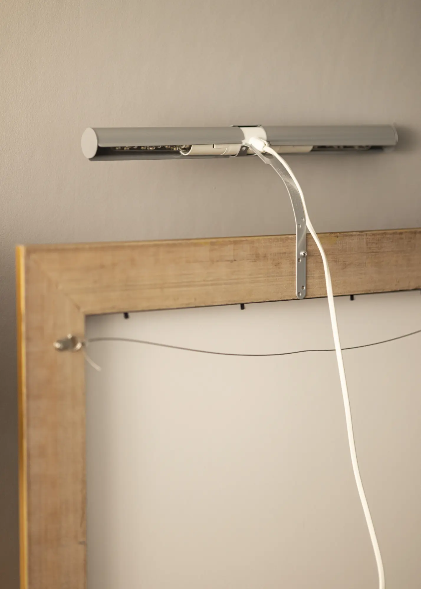 Pour quels tableaux convient l’éclairage ? Normalement, vous attachez l'éclairage de tableau à l'arrière du cadre, mais l'inconvénient est que cela nécessite un cadre en bois (certains cadres en composite fonctionnent également bien) avec un profil large pour pouvoir visser dans le cadre. Avec notre support mural, vous n'avez pas à y penser et pouvez installer simplement votre éclairage de tableau directement sur le mur derrière le tableau.