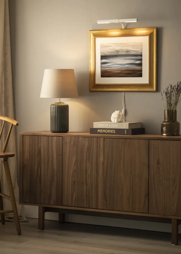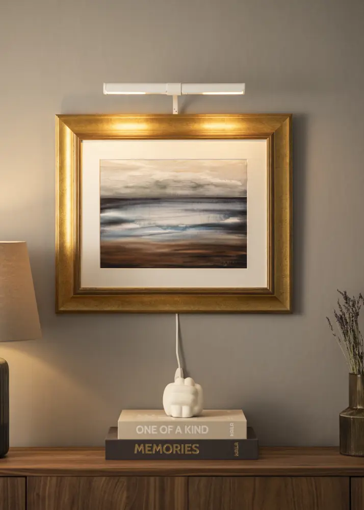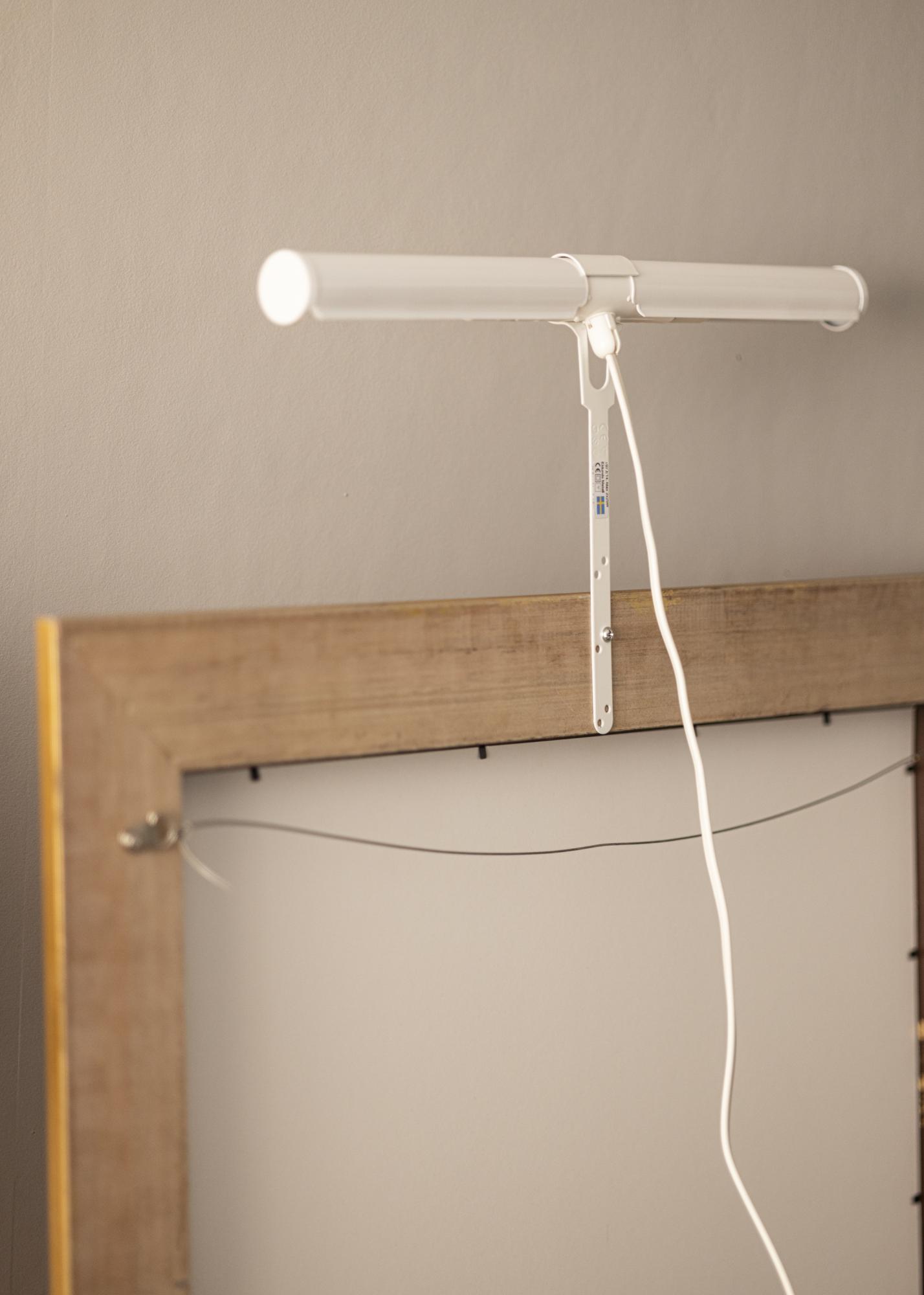 Pour quels tableaux convient l’éclairage ? Normalement, vous attachez l'éclairage de tableau à l'arrière du cadre, mais l'inconvénient est que cela nécessite un cadre en bois (certains cadres en composite fonctionnent également bien) avec un profil large pour pouvoir visser dans le cadre. Avec notre support mural, vous n'avez pas à y penser et pouvez installer simplement votre éclairage de tableau directement sur le mur derrière le tableau.