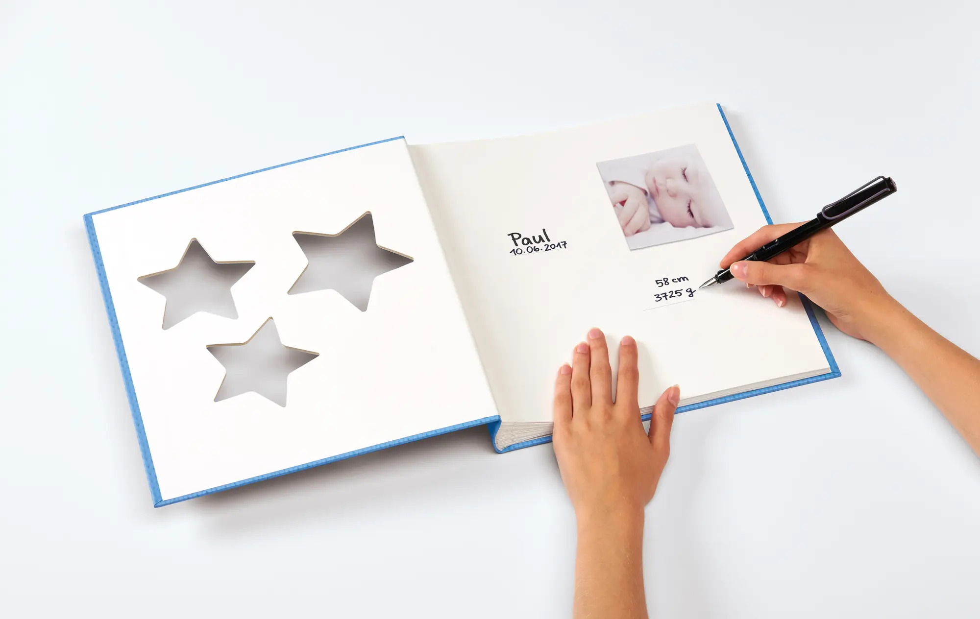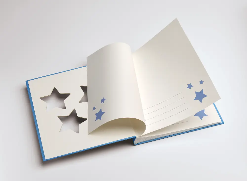 Avec un bébé super mignon à la maison, c'est pratiquement plus la règle que l'exception de remplir différents albums avec des photos de la merveille ! Nous avons ici un album génial avec un motif qui ressemble à de la laine tricotée. À l'avant, il y a 3 ouvertures d'image en forme d'étoiles que vous pouvez remplir avec du texte ou des photos.