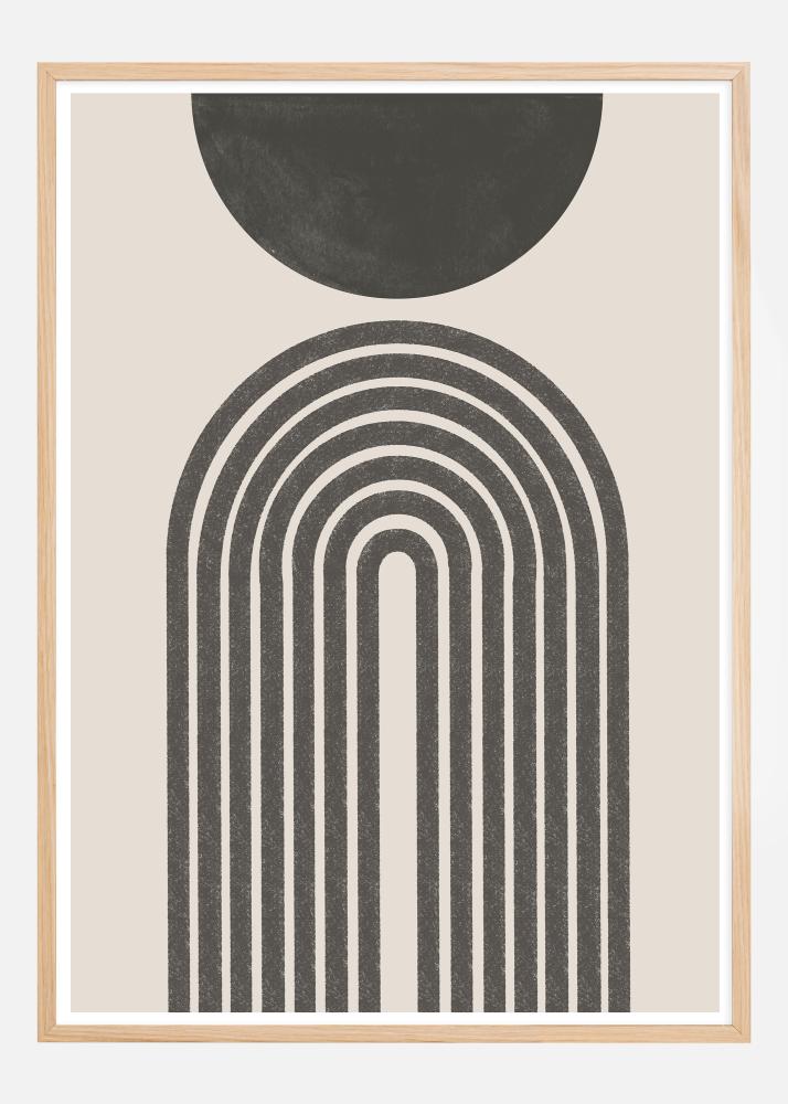 Ce poster artistique montre une fusion de précision géométrique et de douceur organique. La partie supérieure du design est constituée d'un demi-cercle noir qui émet une présence apaisante sur le fond chaud et neutre. En dessous, s'élèvent une série d'arcs noirs qui forment de manière harmonieuse une forme ressemblant à une porte, créant un contraste entre la géométrie stricte et les courbes abstraites du cercle noir. La palette de couleurs simple avec du noir sur un fond blanc cassé donne une impression moderne et élégante, parfaite pour un intérieur contemporain ou un bureau.