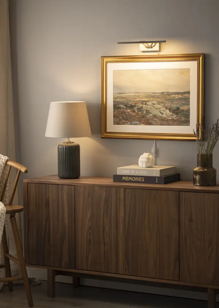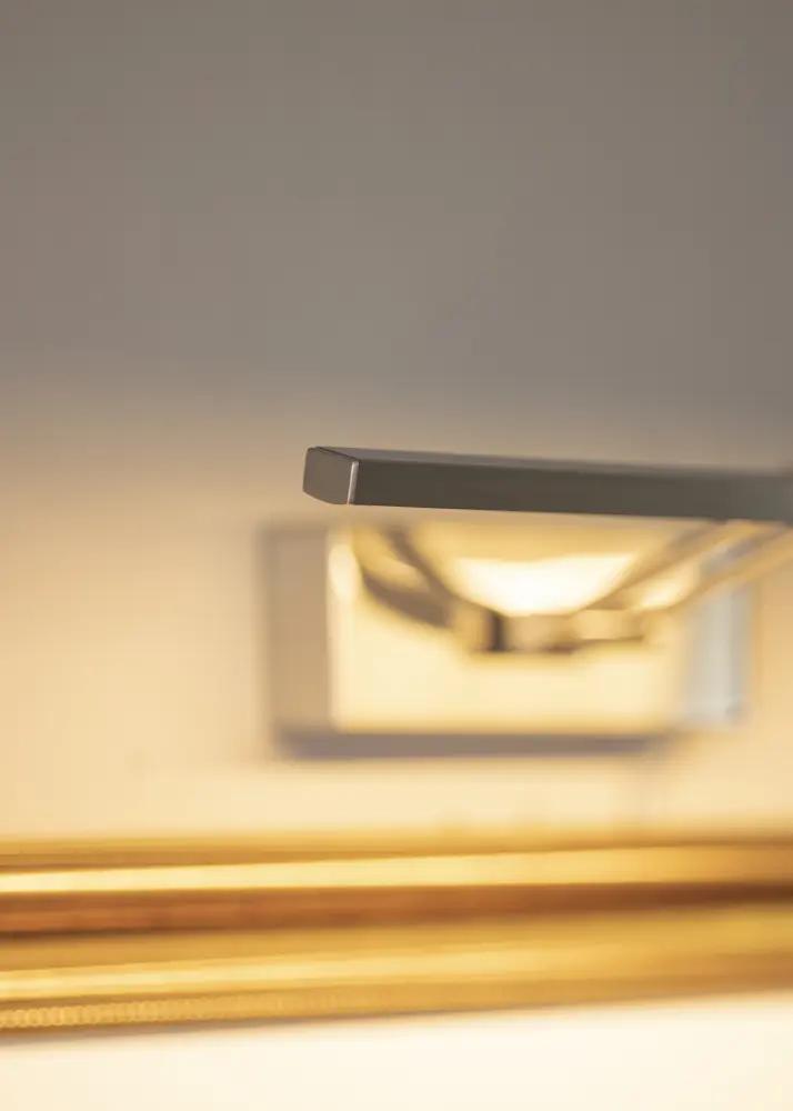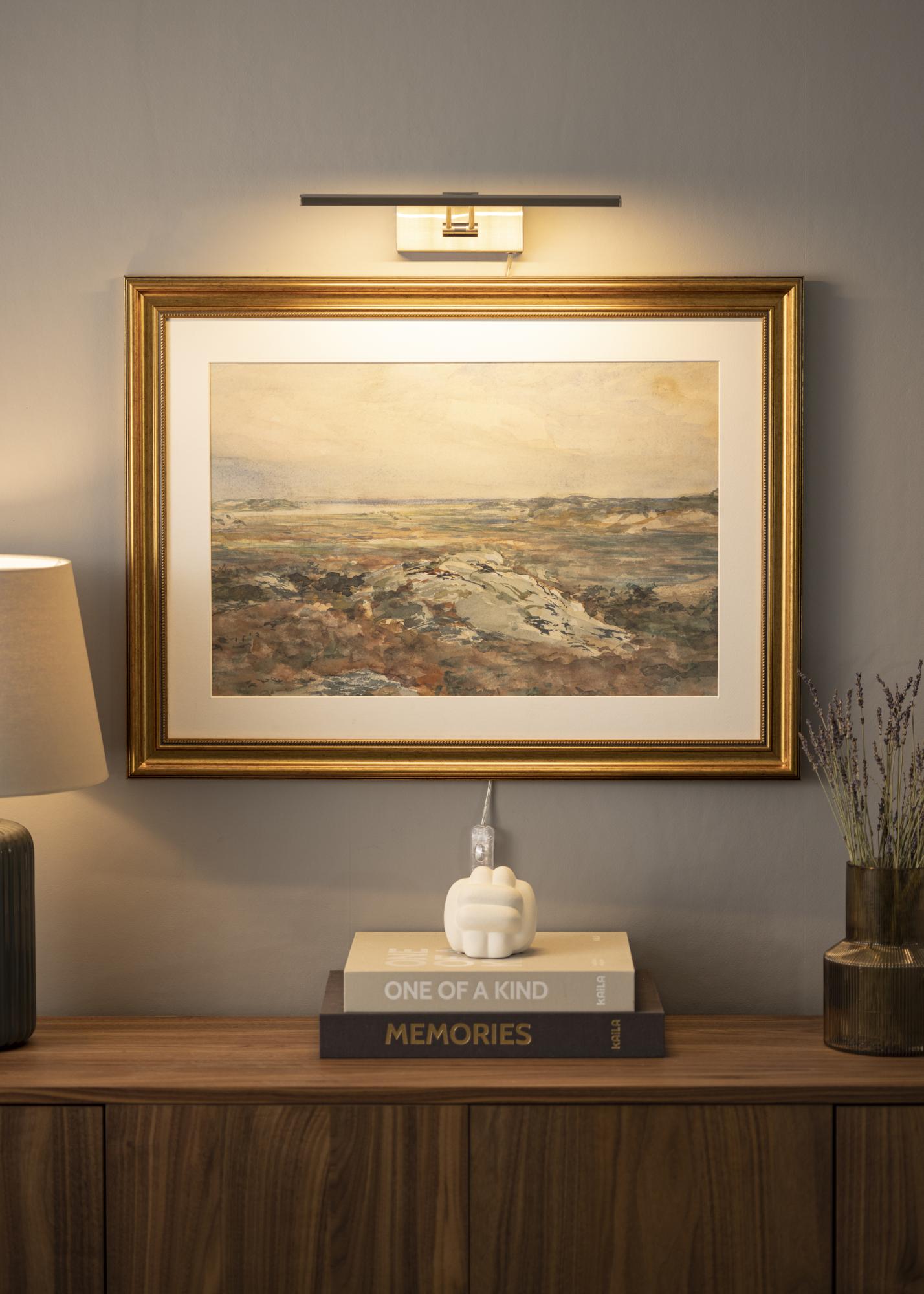 Éclairage de tableau au design nordique moderne qui convient aux tableaux d'une largeur de 60 à 100 cm. L'armature a une hauteur de 5 cm et une longueur de 37 cm avec une distance au mur de 20 cm. Avec son éclairage LED puissant de 720 lumens, vous obtenez un éclairage agréable même sur de plus grands tableaux.