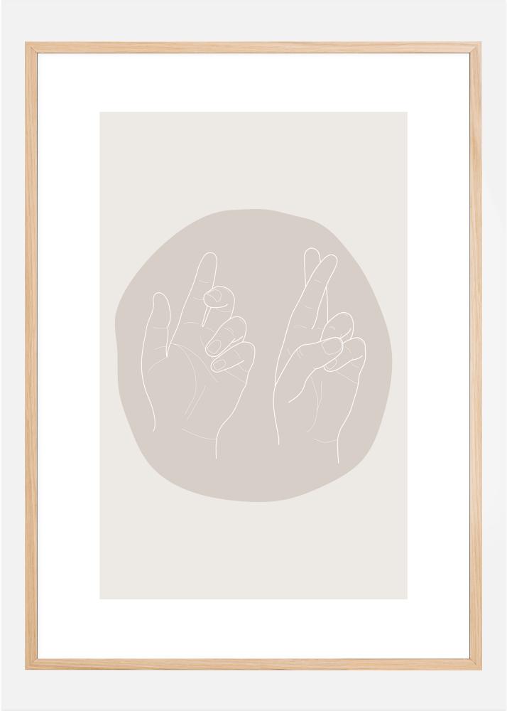 Une affiche représentant deux mains gauches sur une forme circulaire beige. Le cercle a été monté sur un fond de couleur naturel avec les deux mains pointant vers le haut du tirage. Elles sont détendues, créant une ambiance tranquille pour votre maison. L'impression parfaite pour votre bureau de travail.