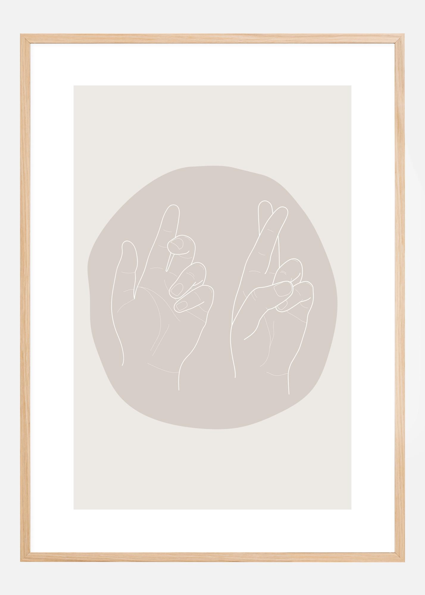 Une affiche représentant deux mains gauches sur une forme circulaire beige. Le cercle a été monté sur un fond de couleur naturel avec les deux mains pointant vers le haut du tirage. Elles sont détendues, créant une ambiance tranquille pour votre maison. L'impression parfaite pour votre bureau de travail.