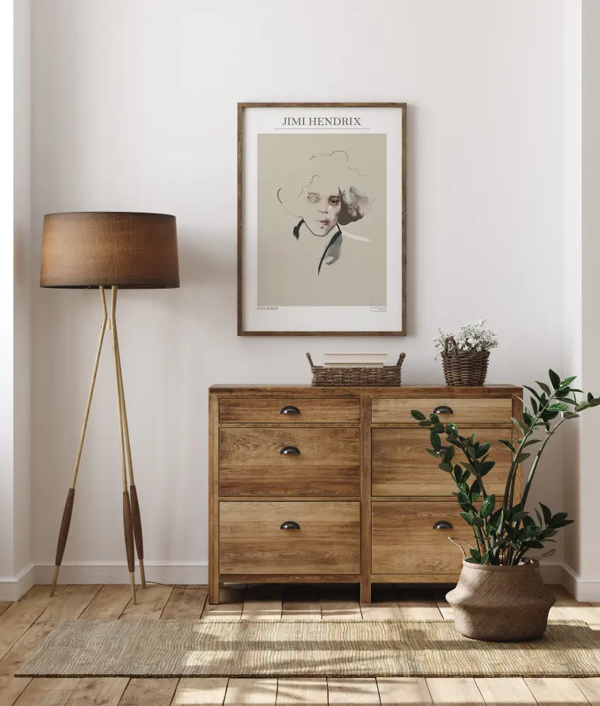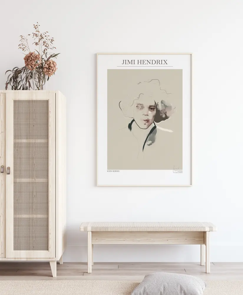 Une belle aquarelle de Jimi Hendrix regardant droit dans l'appareil photo. La partie droite de l’affiche présente des couleurs plus vives, tandis que la partie gauche est plus mélancolique. Les doux coups de pinceau soulignent sa coiffure, tandis qu'une nuance de couleur sombre met en valeur sa veste. Un tirage parfait pour tout musicien, à accrocher dans un studio.