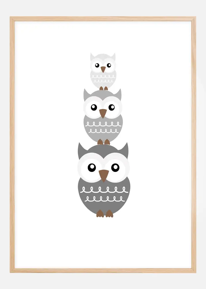 Trois valent mieux qu'un. Art mural avec le numéro un des oiseaux d'intérieur, le hibou. L'illustration de trois hiboux gris sombre stylisés empilés les uns sur les autres sur un fond blanc est devenue un classique moderne. Le motif convient aussi bien au salon qu'à la chambre d'enfant et se marie particulièrement bien avec un intérieur qui reprend la couleur de la peinture. Combinez avec d'autres oiseaux ou animaux pour une sensation sauvage.