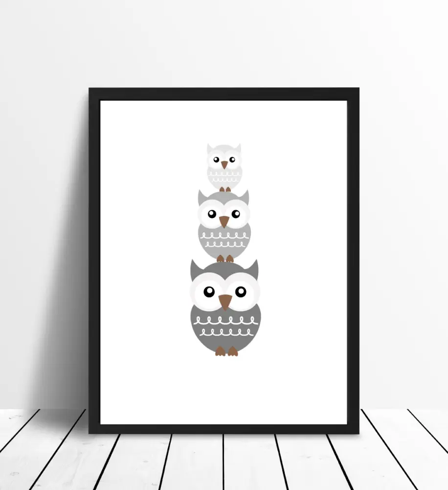 Trois c'est mieux qu'un. Art mural avec le numéro un des oiseaux d'intérieur, le hibou. L'illustration de trois hiboux gris souris stylisés empilés les uns sur les autres sur un fond blanc est devenue un classique moderne. Le motif convient aussi bien au salon qu'à la chambre d'enfant et se marie particulièrement bien avec un intérieur qui reprend la couleur du tableau. Combinez avec d'autres oiseaux ou animaux pour une sensation sauvage.