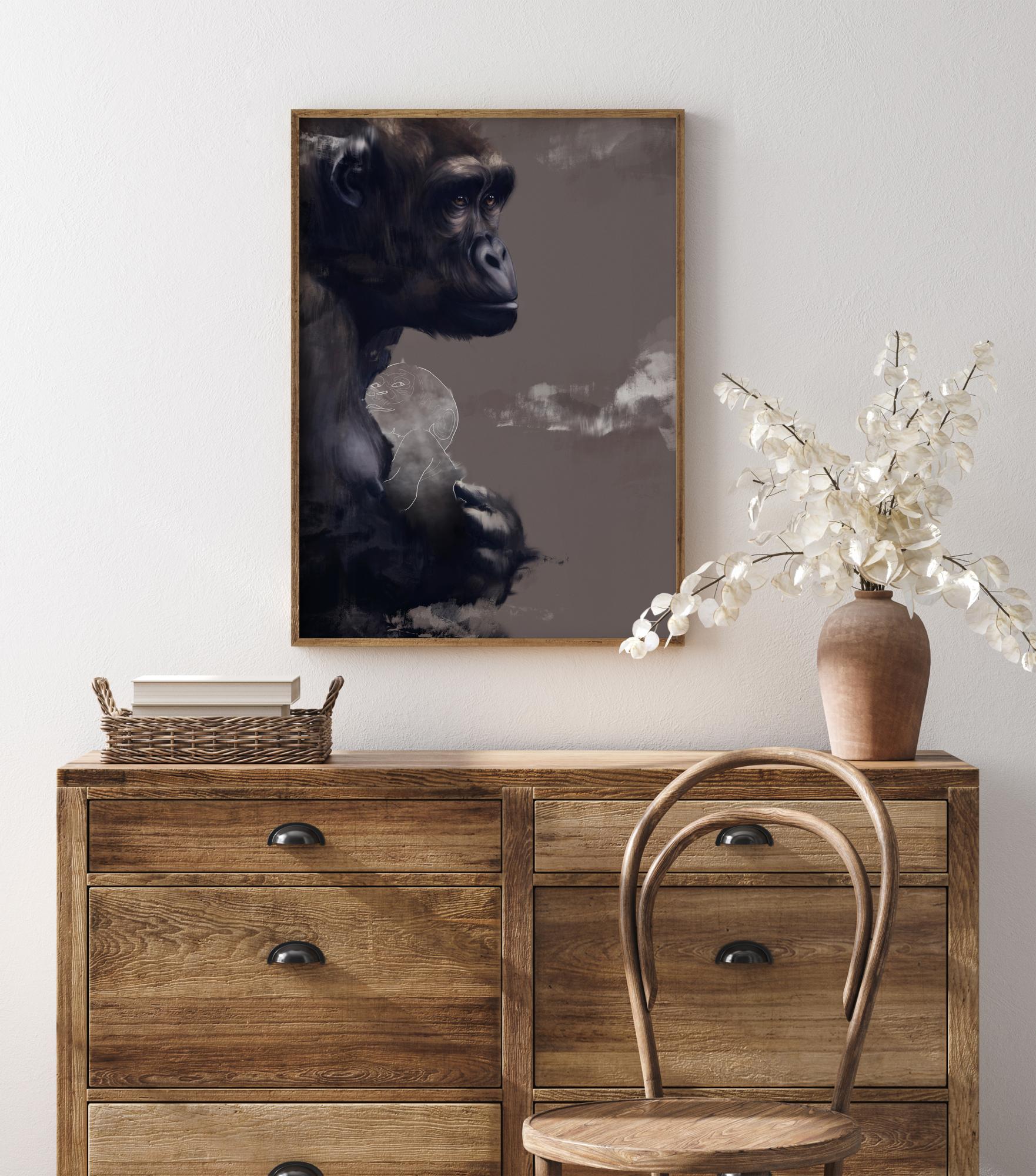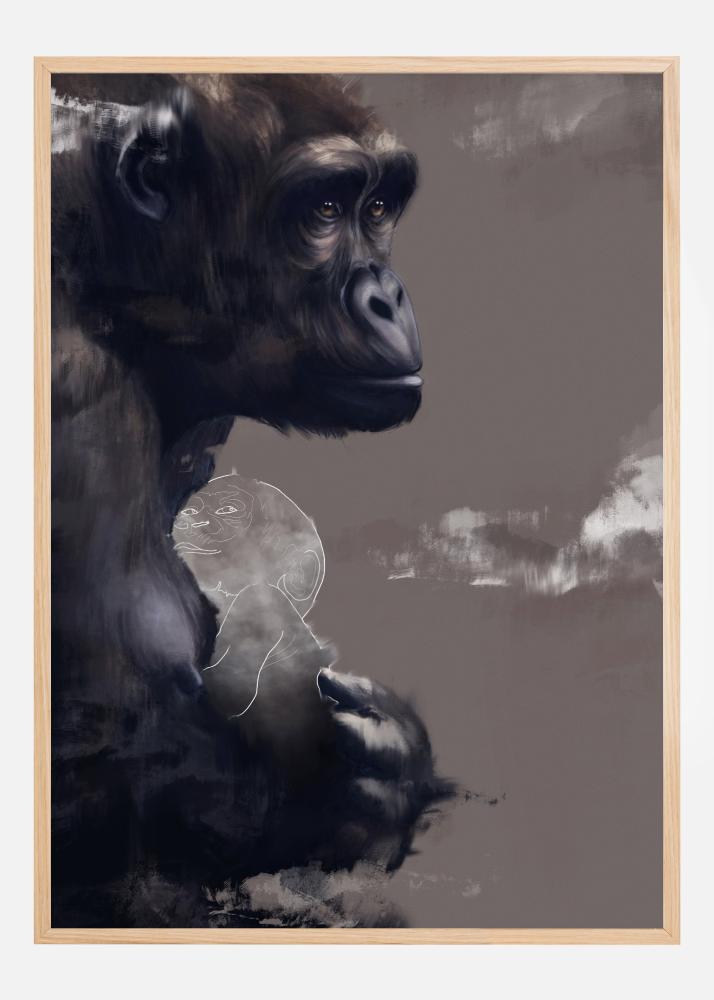 Une affiche nature saisissante représentant un gorille tenant son nouveau-né. Sur un fond marron clair, ce mammifère trapu fait preuve d'un instinct maternel puissant mais doux. Protégeant le nouveau-né dans ses bras aimants, cette impression inachevée d'un gorille est l’affiche idéale pour tout amateur d'animaux.